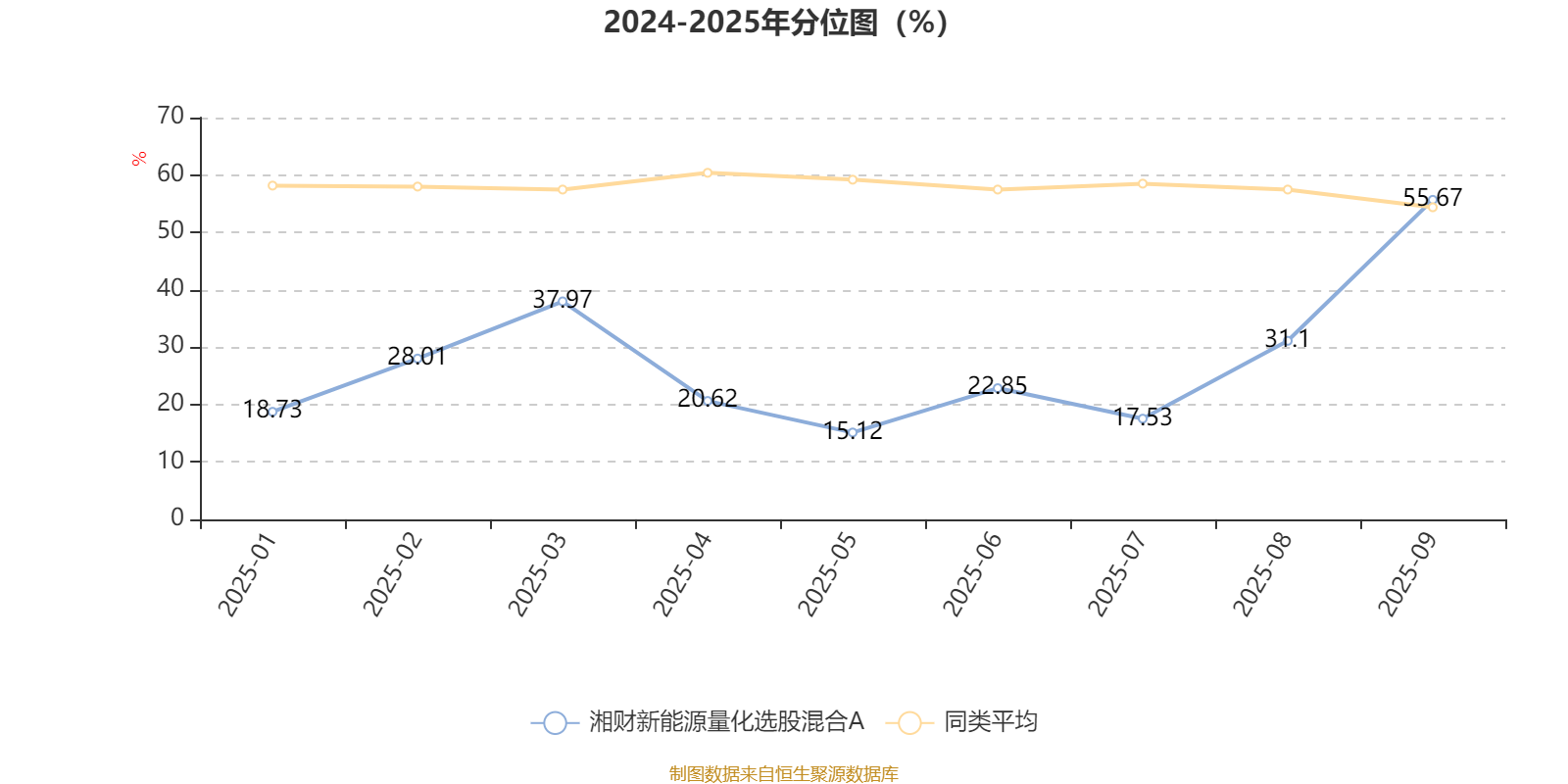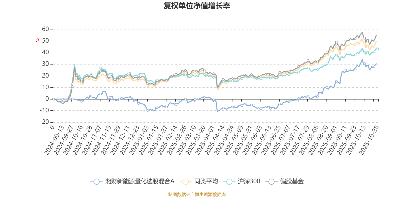 截至10月27日,湘财新能源量化选股混合A近三个月复权单位净值增长率为28.58%,位于同类可比基金105/689;近半年复权单位净值增长率为39.89%,位于同类可比基金167/688;近一年复权单位净值增长率为26.87%,位于同类可比基金333/653。