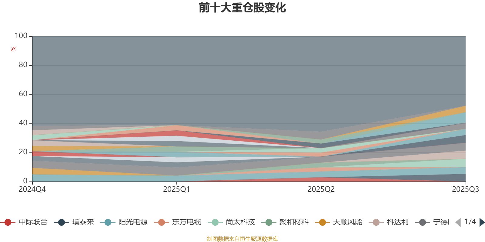 截至2025年三季度末,基金十大重仓股分别是先导智能、尚太科技、科达利、宁德时代、厦钨新能、璞泰来、阳光电源、恩捷股份、宏发股份、明阳电气。