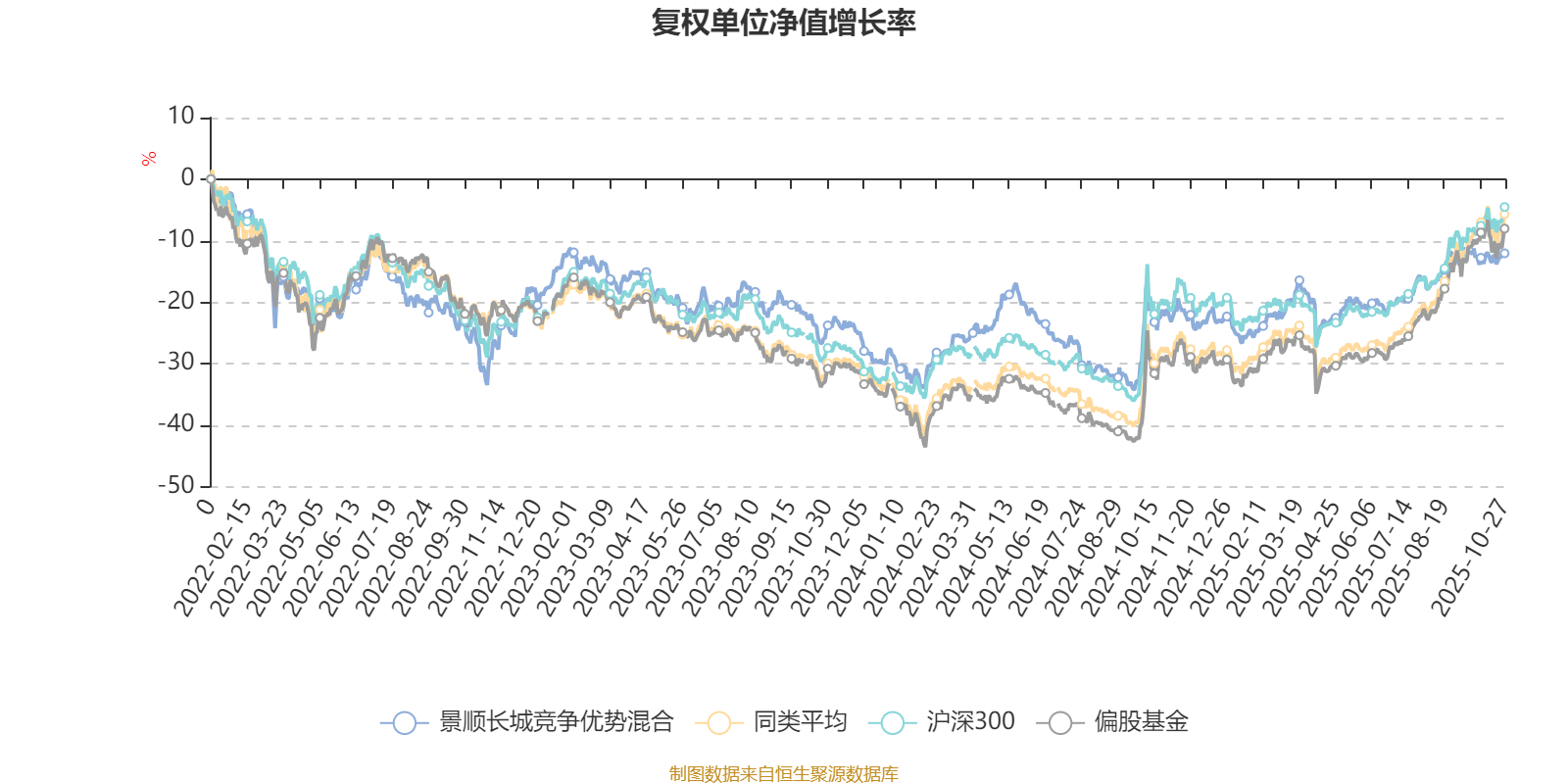截至10月27日,景顺长城竞争优势混合近三个月复权单位净值增长率为4.89%,位于同类可比基金113/130;近半年复权单位净值增长率为13.52%,位于同类可比基金112/130;近一年复权单位净值增长率为12.61%,位于同类可比基金114/130;近三年复权单位净值增长率为27.84%,位于同类可比基金53/124。