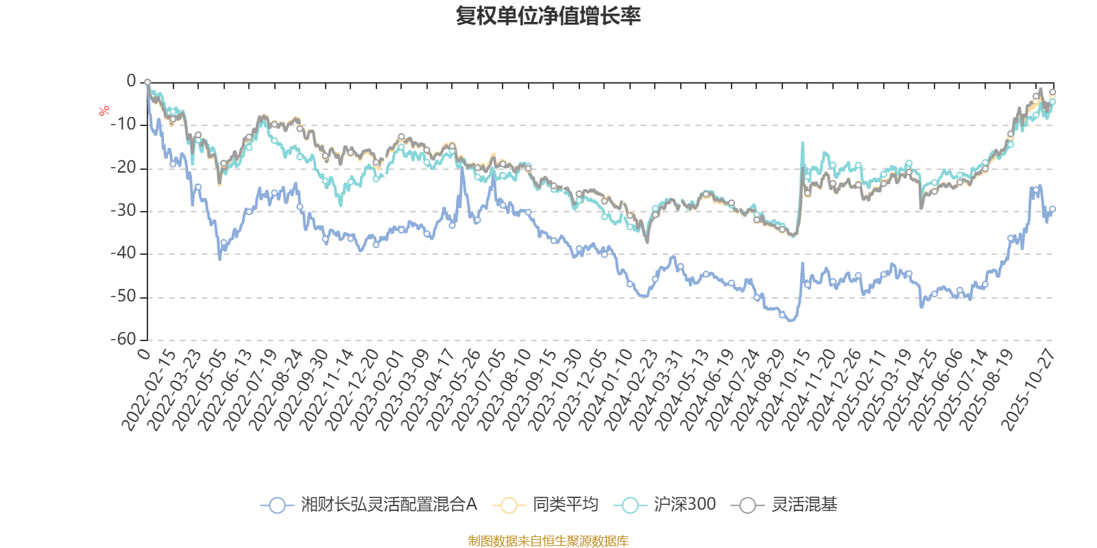 截至10月27日,湘财长弘灵活配置混合A近三个月复权单位净值增长率为25.14%,位于同类可比基金274/1287;近半年复权单位净值增长率为38.94%,位于同类可比基金298/1287;近一年复权单位净值增长率为31.32%,位于同类可比基金418/1287;近三年复权单位净值增长率为8.89%,位于同类可比基金800/1286。