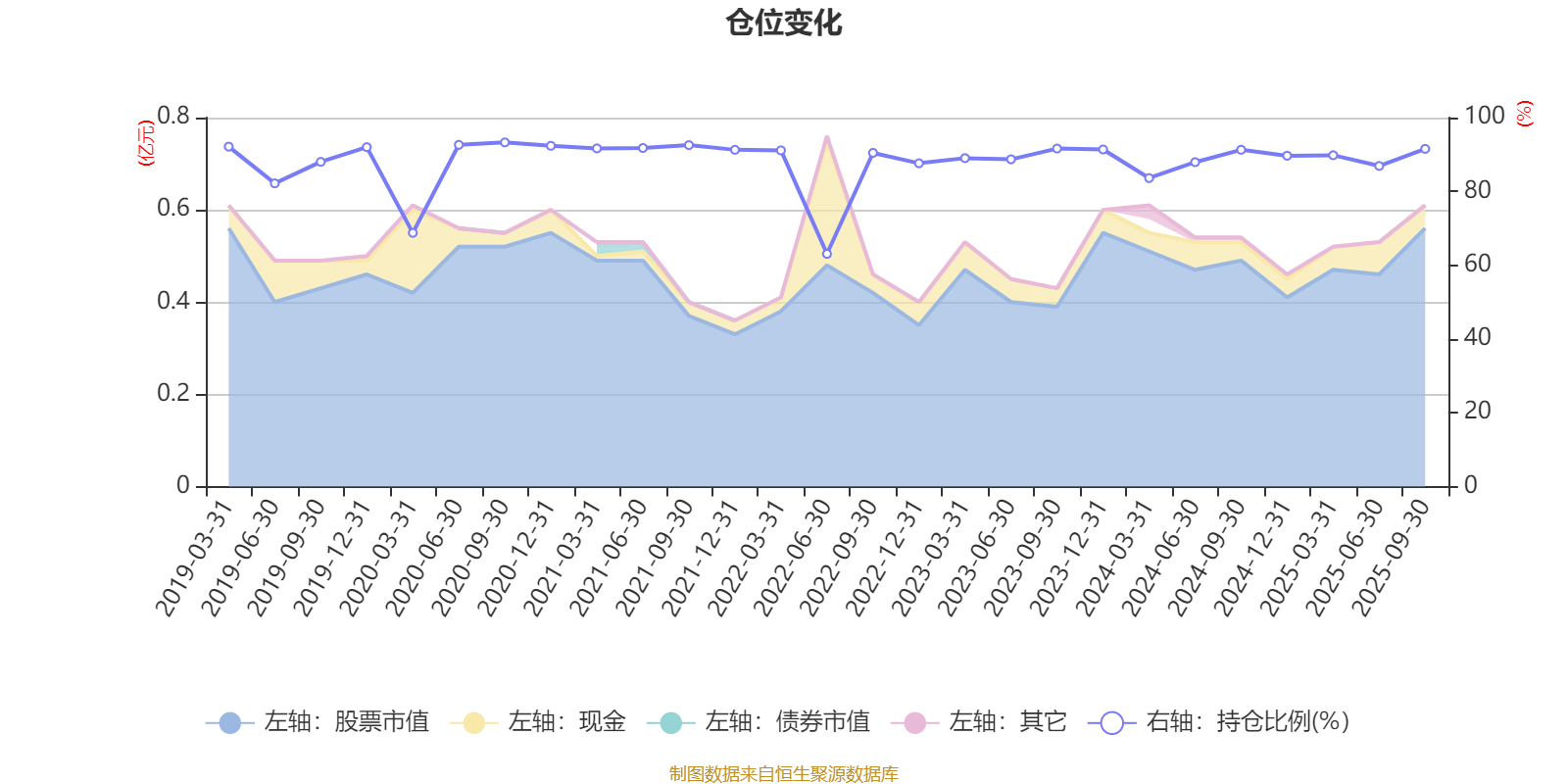 据定期报告数据统计,近三年平均股票仓位为89.08%,同类平均为72.35%。2020年三季度末基金达到93.27%的最高仓位,2022年上半年末最低,为63.07%。