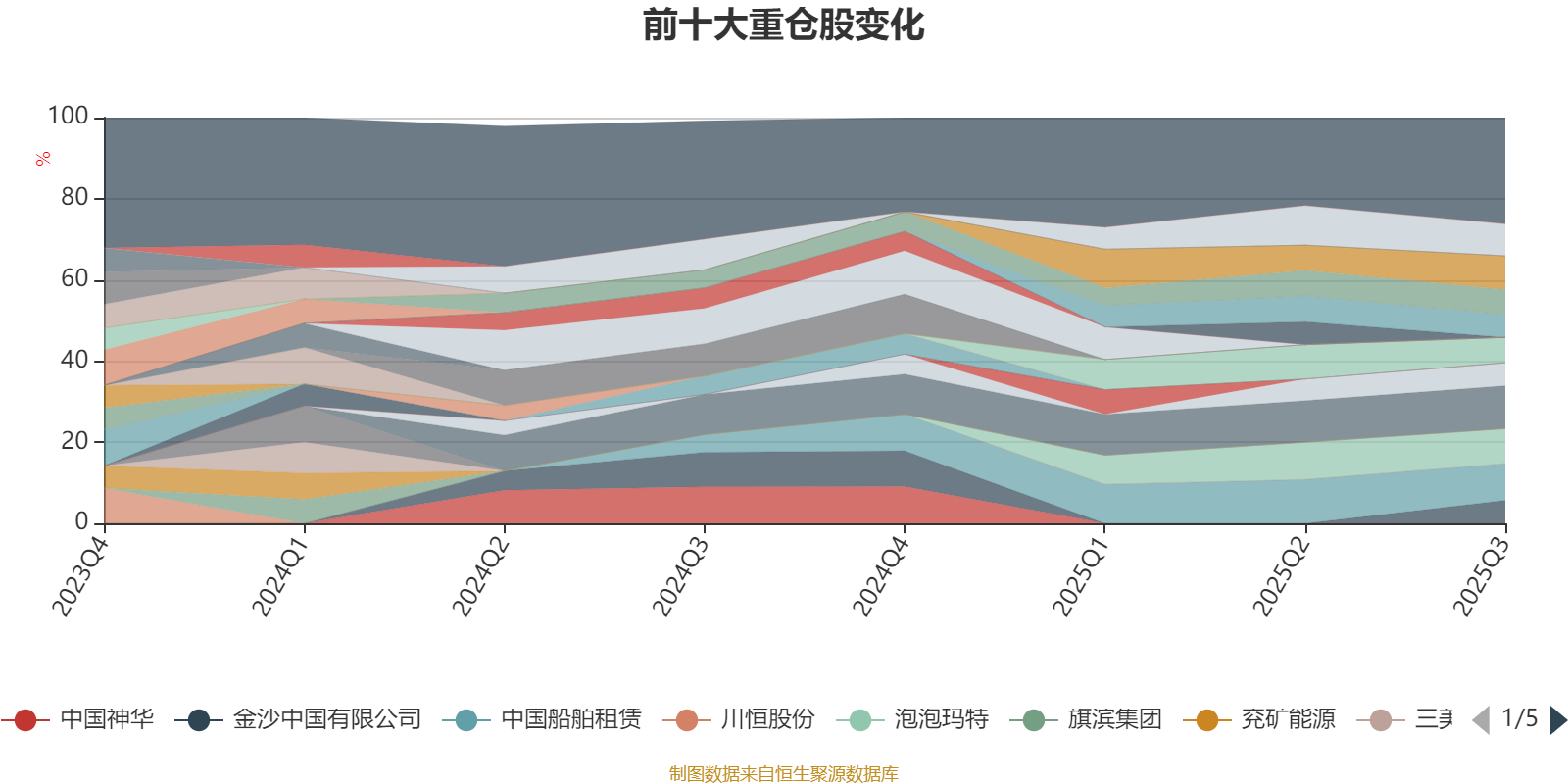 该基金持股集中度较高,近2年前十大重仓股集中度长期超过60%。截至2025年三季度末,基金十大重仓股分别是腾讯控股、中国船舶租赁、泡泡玛特、阿里巴巴-W、中远海能、香港交易所、海丰国际、汇丰控股、金沙中国有限公司、美高梅中国。