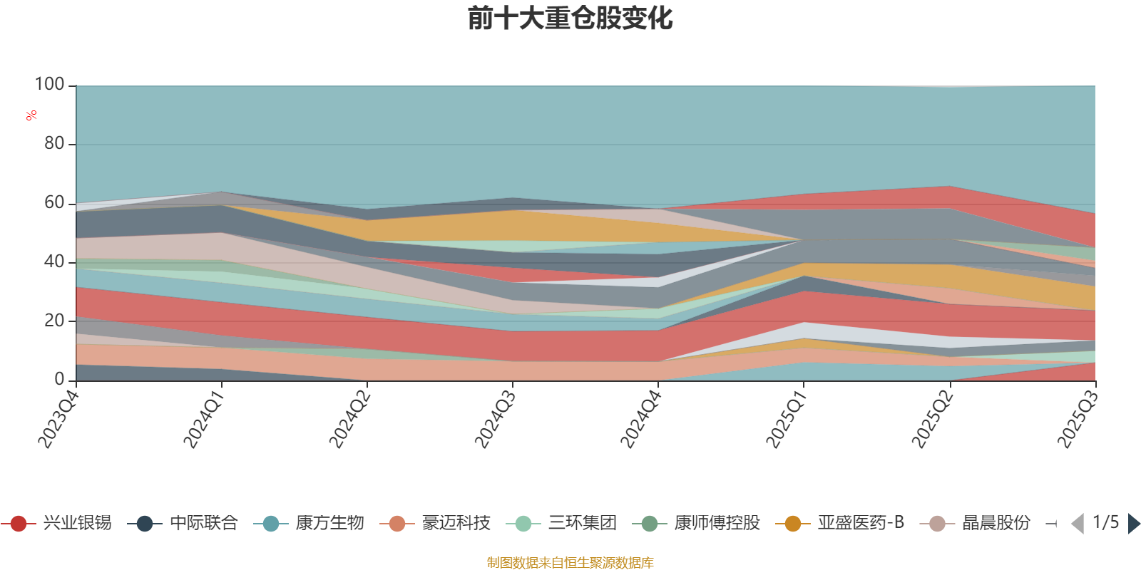 该基金持股集中度较高。截至2025年三季度末,基金十大重仓股分别是兆易创新、腾讯控股、金斯瑞生物科技、兴业银锡、华虹半导体、三环集团、百济神州、三美股份、阿里巴巴-W、圣农发展。