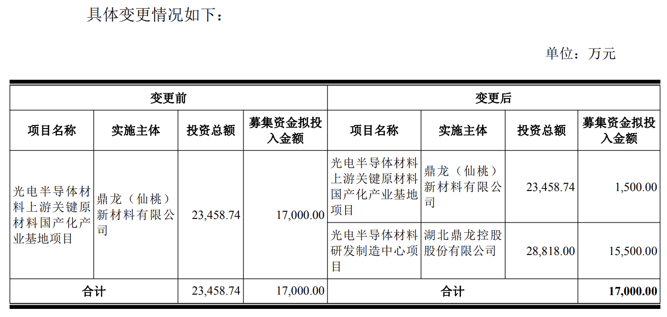 考虑“光电半导体材料研发制造中心”实施更具迫切性,更符合公司现阶段市场拓展以及发展战略布局之需,鼎龙股份本次拟将“光电半导体材料上游关键原材料国产化产业基地项目”尚未使用的部分募集资金用于“光电半导体材料研发制造中心项目”。