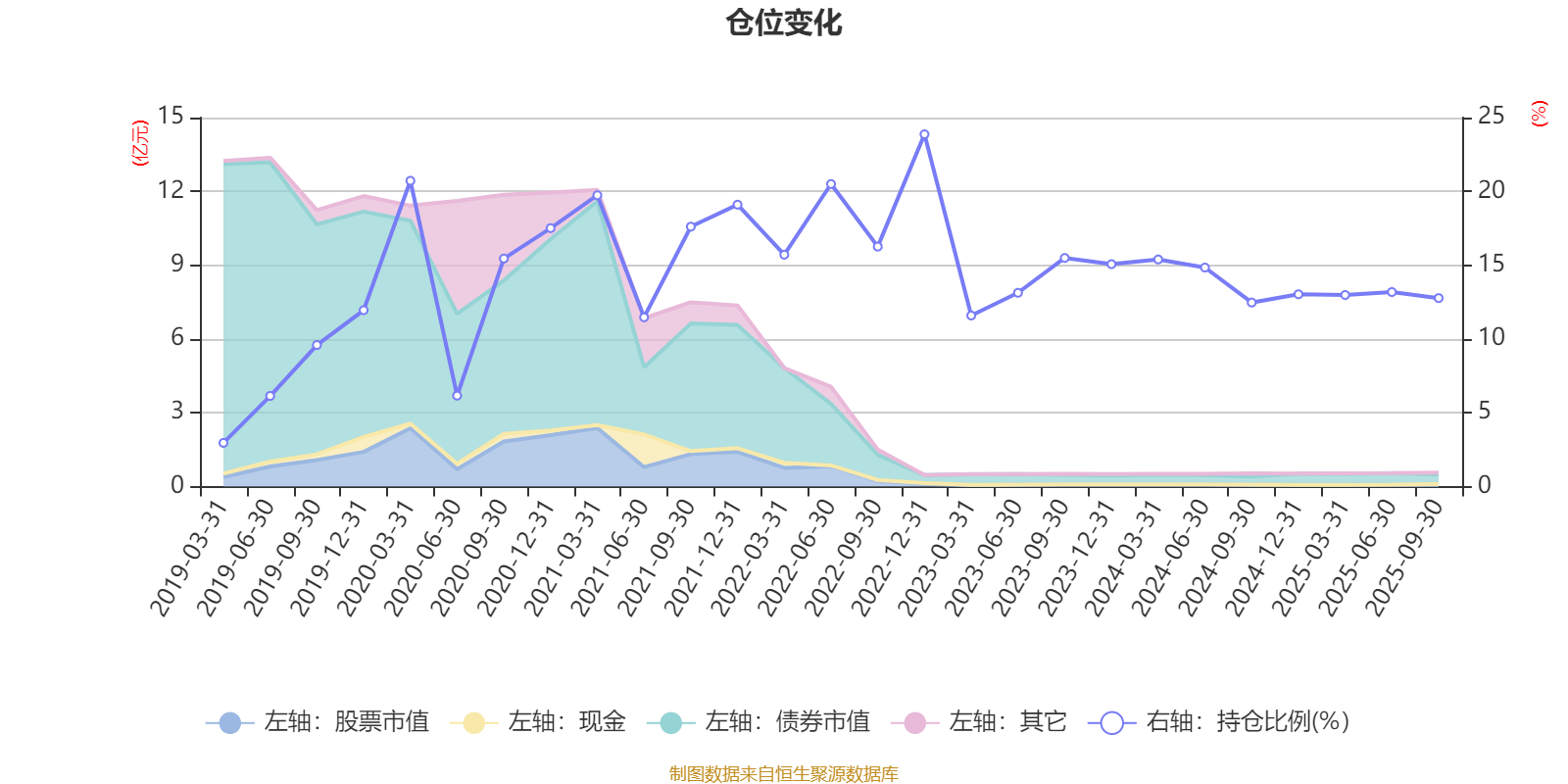 据定期报告数据统计,近三年平均股票仓位为14.48%,同类平均为19.14%。2022年末基金达到23.87%的最高仓位,2019年一季度末最低,为2.96%。