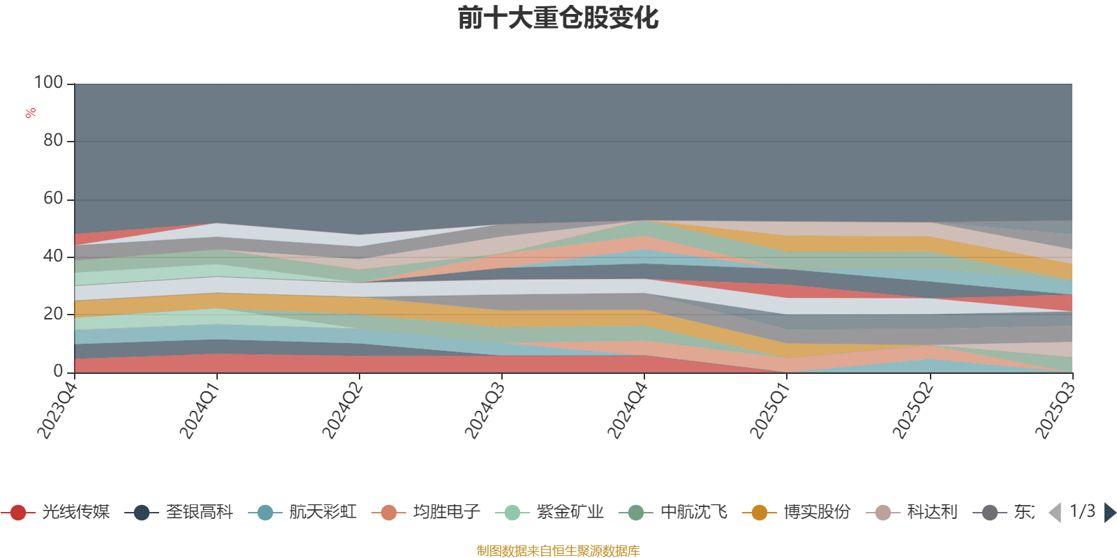 截至2025年三季度末,基金十大重仓股分别是芒果超媒、长盈精密、东方财富、科达利、中航沈飞、双环传动、中国银河、中国海油、航天电子、温氏股份。