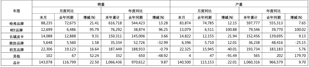 长城汽车10月销量14万台 同比增长22.50%