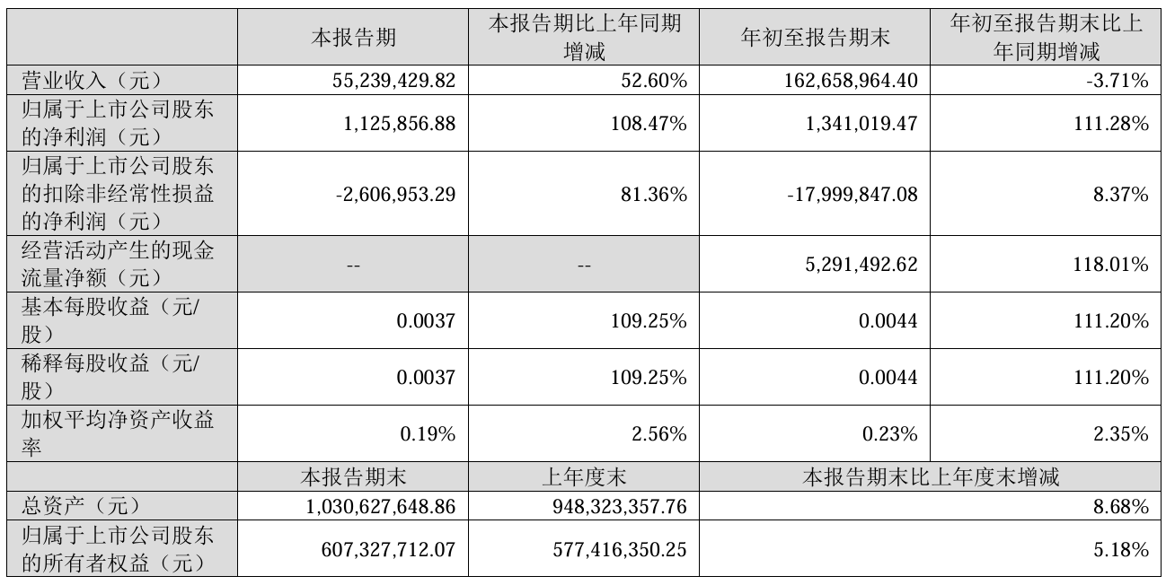 其中,第三季度,公司营业收入为5524万元,同比上升52.6%;归母净利润自去年同期亏损1329万元成功扭亏,实现归母净利润113万元;扣非归母净利润自去年同期亏损1398万元变为亏损261万元,亏损同比减少。