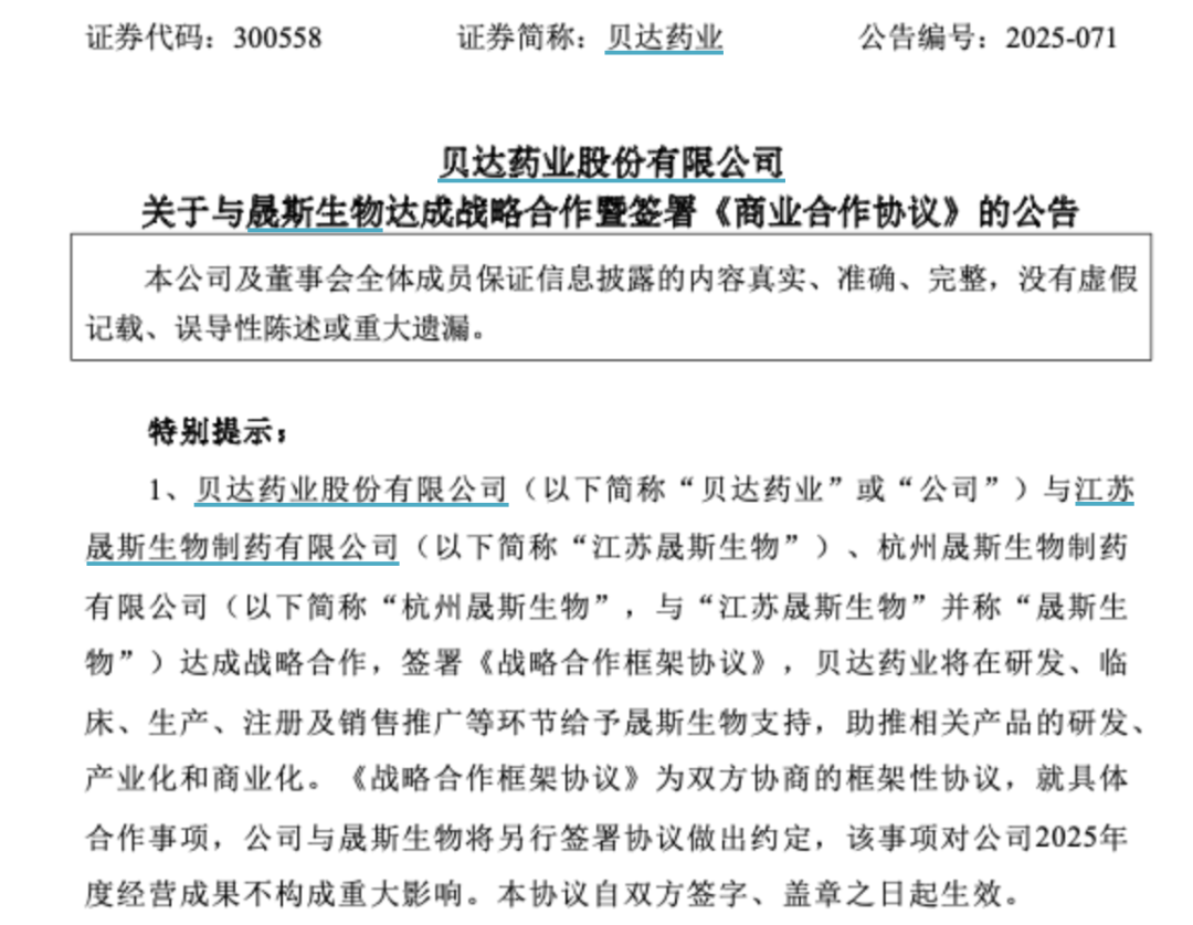 公告显示,为进一步拓展公司新药创新技术平台,丰富产品管线布局,近日,贝达药业与江苏晟斯生物、杭州晟斯生物达成战略合作,签署《战略合作框架协议》,贝达药业将在研发、临床、生产、注册及销售推广等环节给予晟斯生物支持,助推相关产品的研发、产业化和商业化。