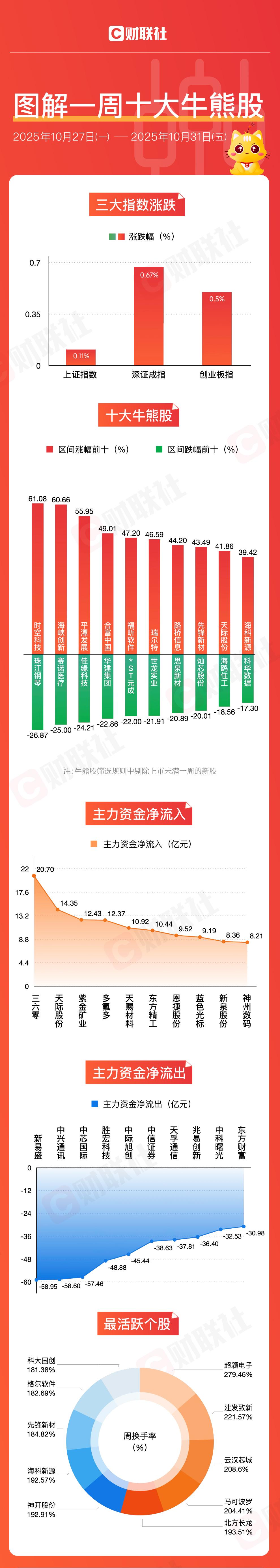 财联社11月2日讯,本周A股三大指数震荡拉升,其中上证指数周涨0.11%,深成指周涨0.67%,创业板指周涨0.50%。本周能源金属、电池、生物制品板块涨幅居前,海南自贸区、硅能源、氟化工、海峡两岸概念股表现活跃。