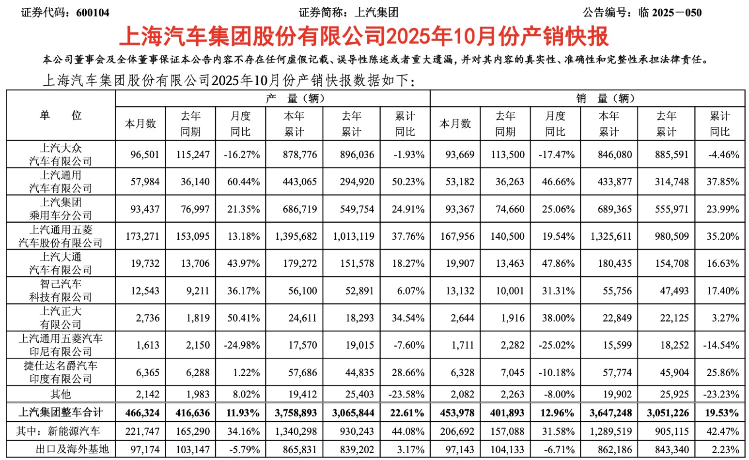 11月2日,上汽集团(600104)发布2025年10月份产销快报,10月份公司整车销量为45.40万辆,同比增长12.96%。