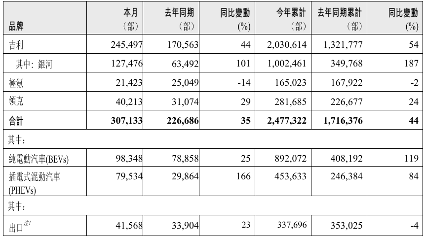 吉利汽车10月销量同比增长约35% 插电式混动汽车增长突出