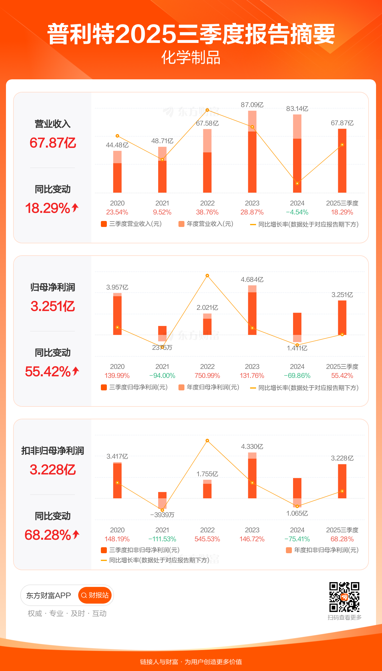 普利特10月28日发布2025年三季报显示,公司前三季实现营业收入67.87亿元,同比增长18.29%;归母净利润3.25亿元,同比增长55.42%;扣非归母净利润3.23亿元,同比增长68.28%