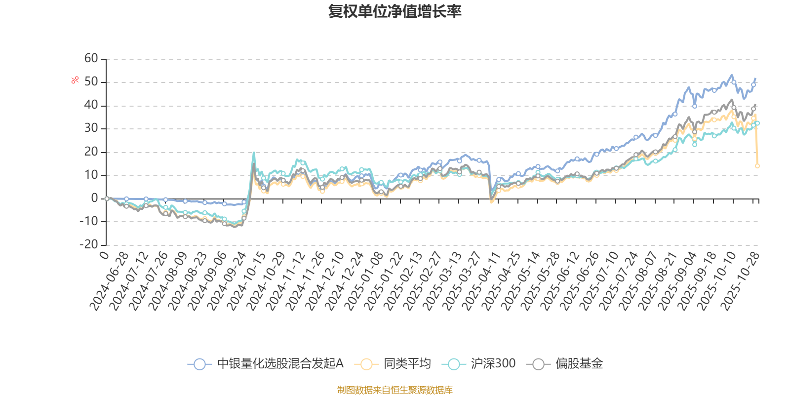 截至10月27日,中银量化选股混合发起A近三个月复权单位净值增长率为20.38%,位于同类可比基金208/689;近半年复权单位净值增长率为37.17%,位于同类可比基金204/688;近一年复权单位净值增长率为40.34%,位于同类可比基金157/653。