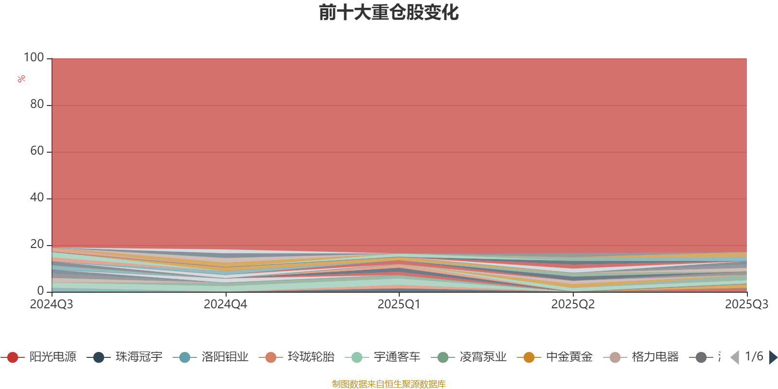 截至2025年三季度末,基金十大重仓股分别是寒武纪、新易盛、中金黄金、阿里巴巴-W、新强联、药明康德、阳光电源、万辰集团、澜起科技、先导智能。