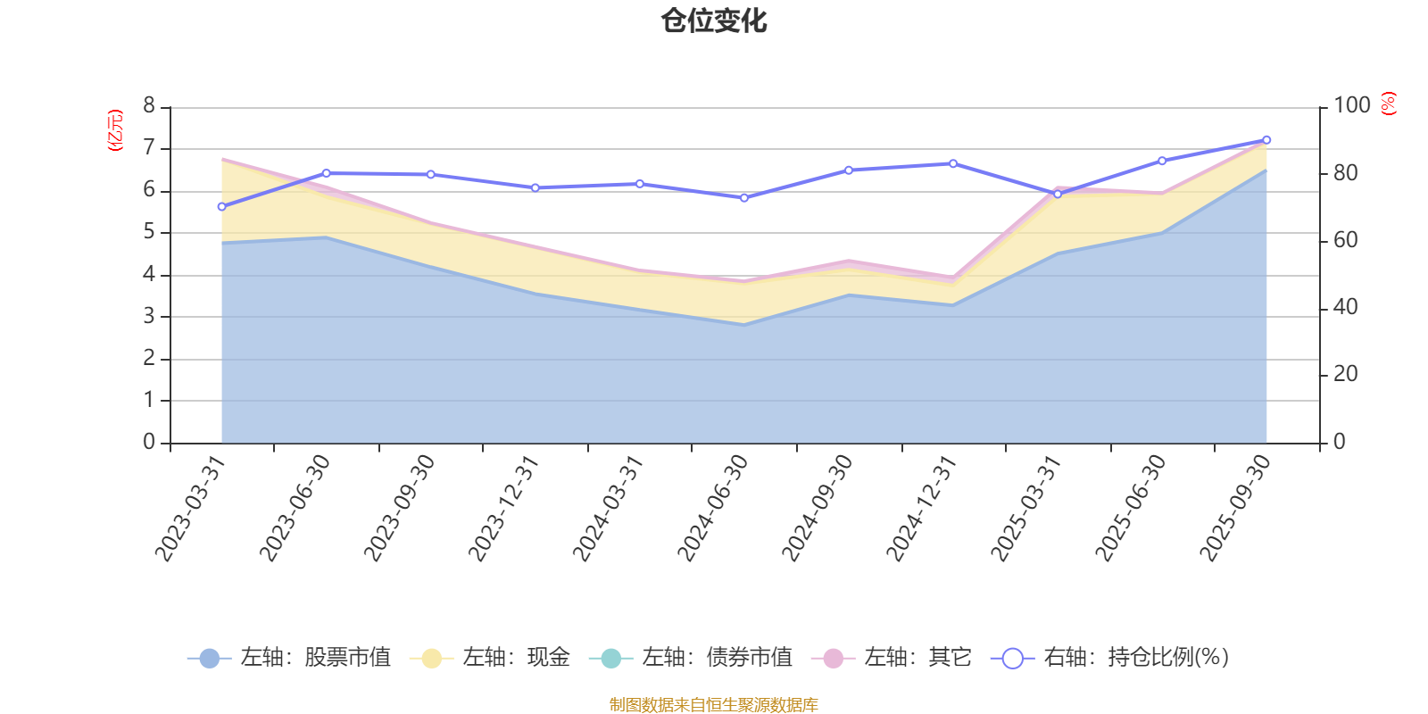 据定期报告数据统计,成立以来平均股票仓位为79.06%,同类平均为85.99%。2025年三季度末基金达到90.23%的最高仓位,2023年一季度末最低,为70.38%。