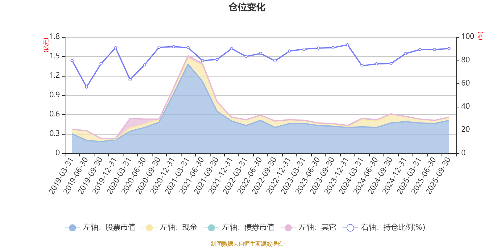 据定期报告数据统计,近三年平均股票仓位为86.33%,同类平均为72.35%。2023年末基金达到93.33%的最高仓位,2019年上半年末最低,为57.01%。