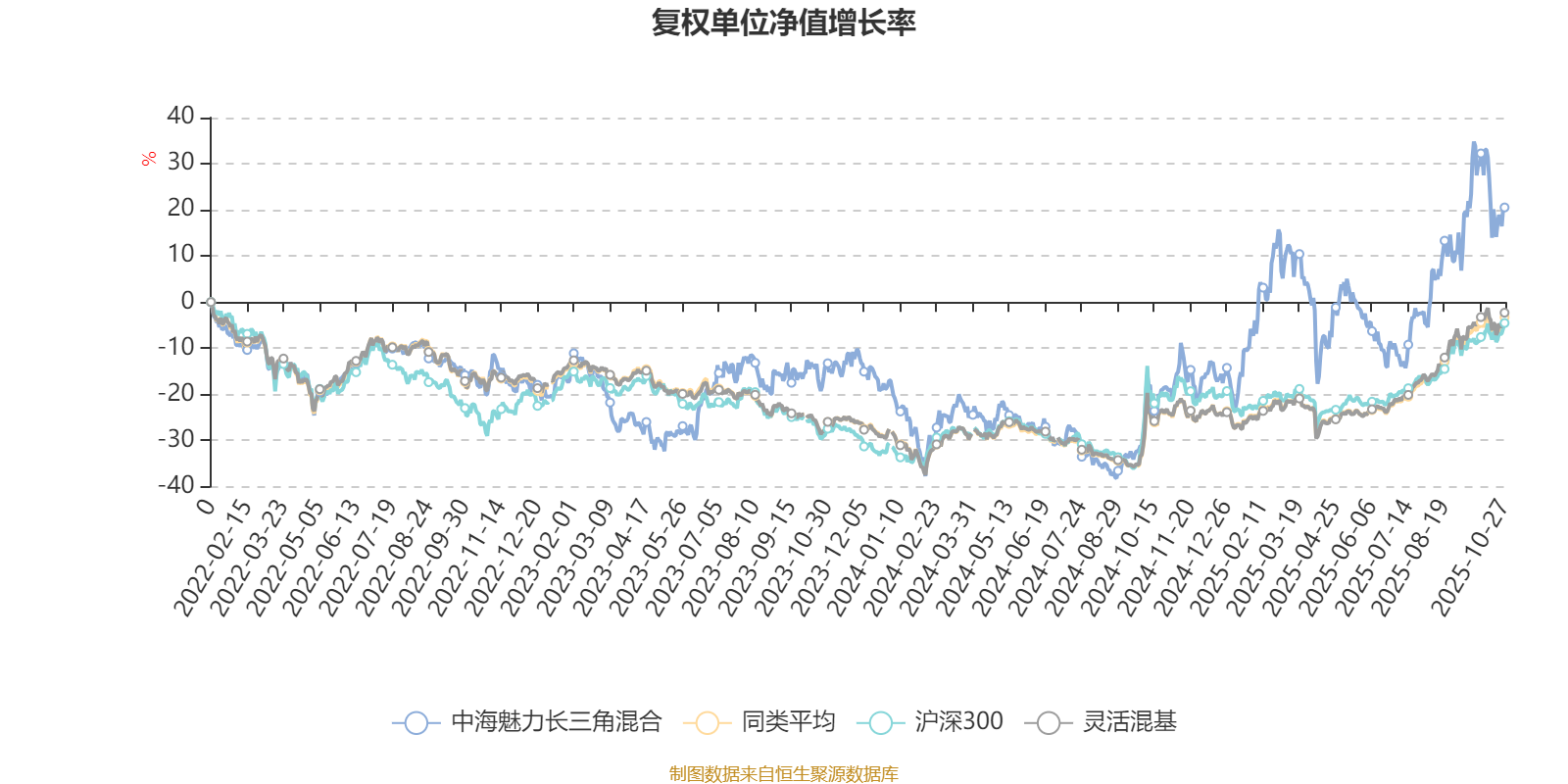 截至10月27日,中海魅力长三角混合近三个月复权单位净值增长率为23.51%,位于同类可比基金311/1287;近半年复权单位净值增长率为21.93%,位于同类可比基金708/1287;近一年复权单位净值增长率为47.73%,位于同类可比基金186/1287;近三年复权单位净值增长率为46.26%,位于同类可比基金162/1286。