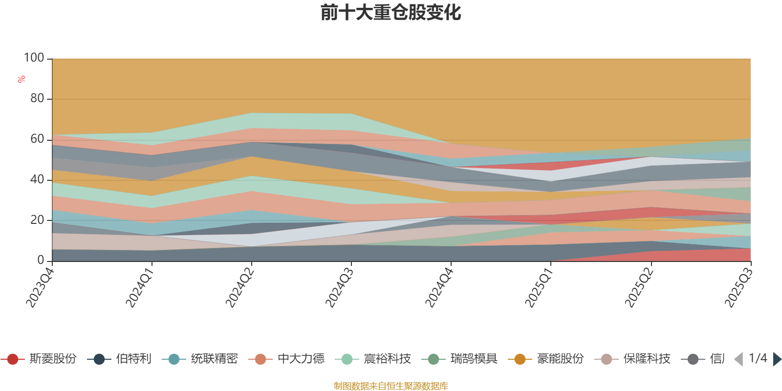 该基金持股集中度较高。截至2025年三季度末,基金十大重仓股分别是拓普集团、浙江荣泰、统联精密、银轮股份、斯菱股份、震裕科技、汉威科技、鸣志电器、北特科技、信质集团。