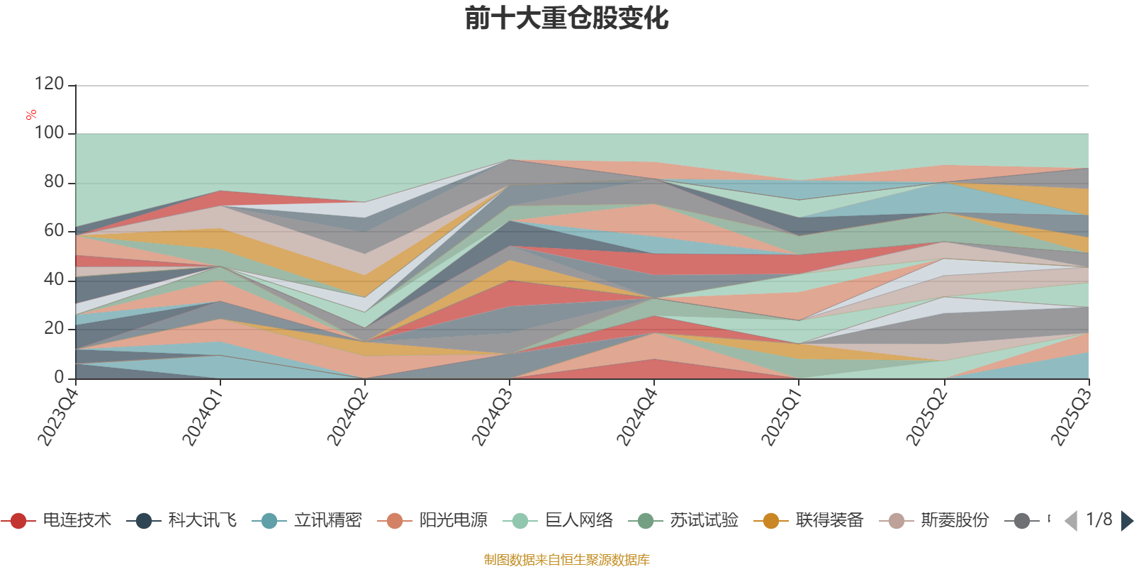 该基金持股集中度较高,近2年前十大重仓股集中度长期超过60%。截至2025年三季度末,基金十大重仓股分别是工业富联、立讯精密、中际旭创、震裕科技、沪电股份、新易盛、阳光电源、海光信息、茂莱光学、寒武纪。