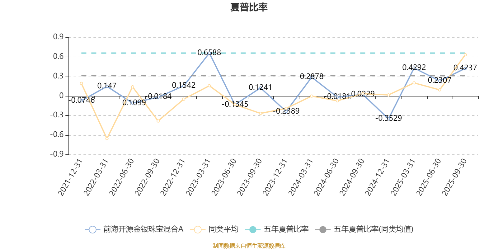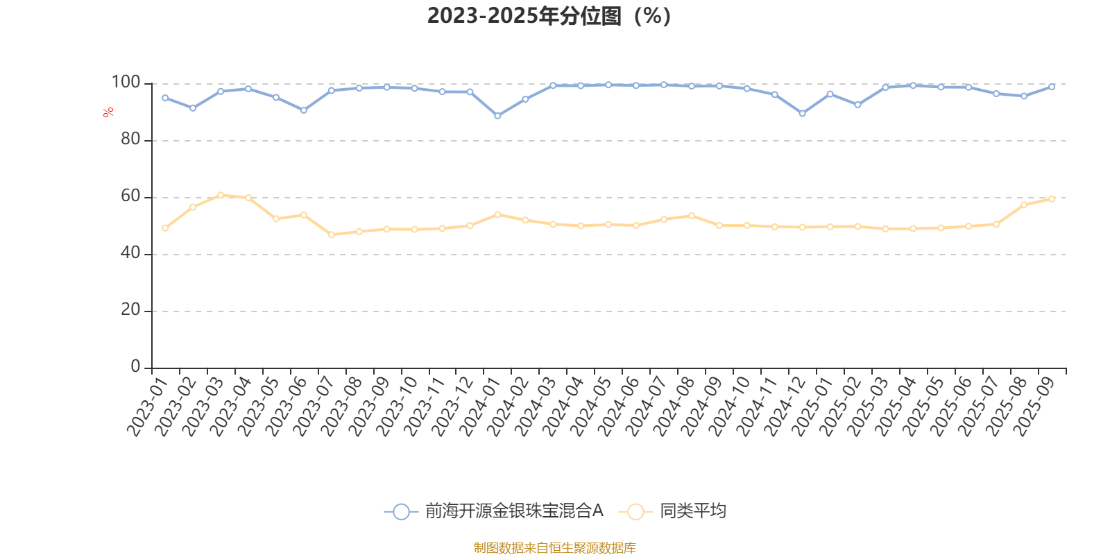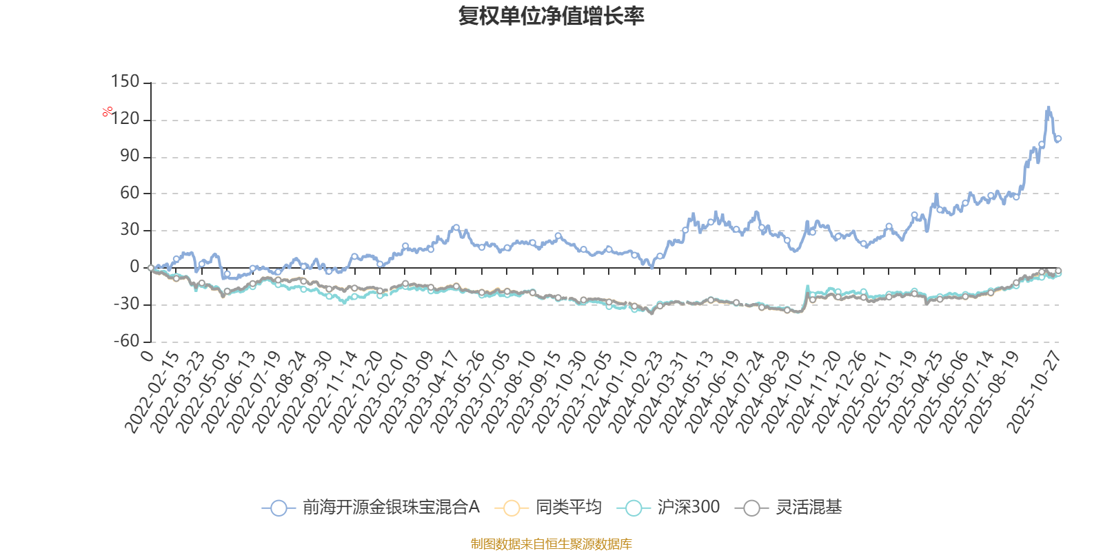 截至10月27日,前海开源金银珠宝混合A近三个月复权单位净值增长率为28.75%,位于同类可比基金204/1287;近半年复权单位净值增长率为39.22%,位于同类可比基金295/1287;近一年复权单位净值增长率为53.86%,位于同类可比基金130/1287;近三年复权单位净值增长率为105.97%,位于同类可比基金20/1286。