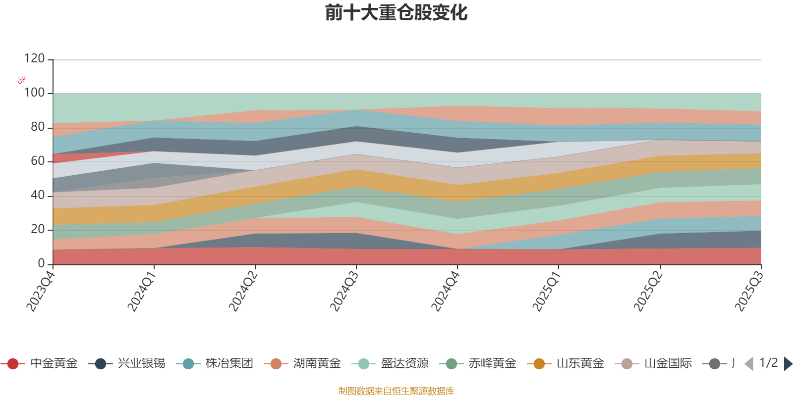 该基金持股集中度较高,且持股标的较为稳定,近2年前十大重仓股集中度长期超过60%。截至2025年三季度末,基金十大重仓股分别是兴业银锡、紫金矿业、中金黄金、盛达资源、赤峰黄金、湖南黄金、株冶集团、山东黄金、西部黄金、山金国际。