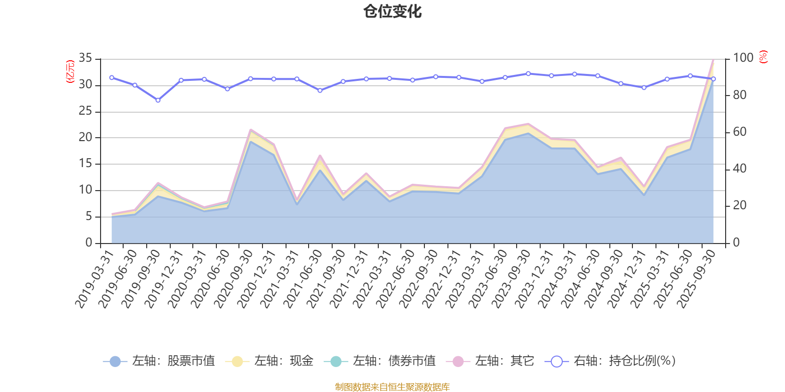 据定期报告数据统计,近三年平均股票仓位为89.4%,同类平均为72.35%。2023年三季度末基金达到91.98%的最高仓位,2019年三季度末最低,为77.55%。