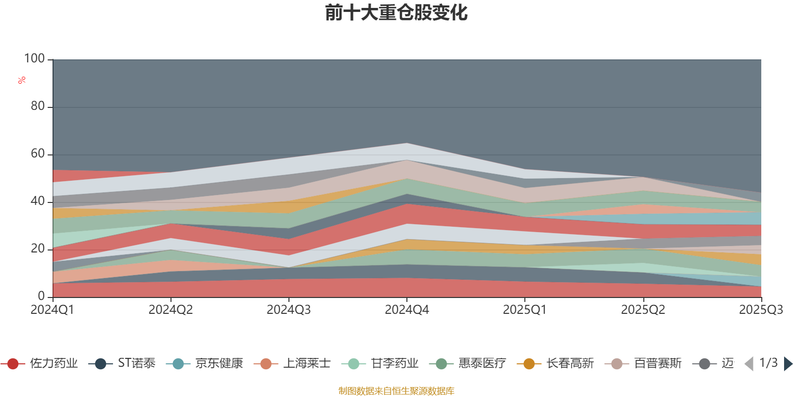 截至2025年三季度末,基金十大重仓股分别是康诺亚-B、惠泰医疗、特宝生物、长春高新、佐力药业、澳华内镜、京东健康、艾德生物、迈普医学、百普赛斯。