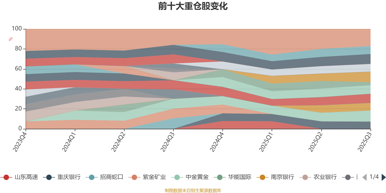 该基金持股集中度较高,近2年前十大重仓股集中度长期超过60%。截至2025年三季度末,基金十大重仓股分别是中金黄金、山金国际、中国太保、中国人寿、成都银行、江苏银行、苏州银行、南京银行、重庆银行、宁沪高速。