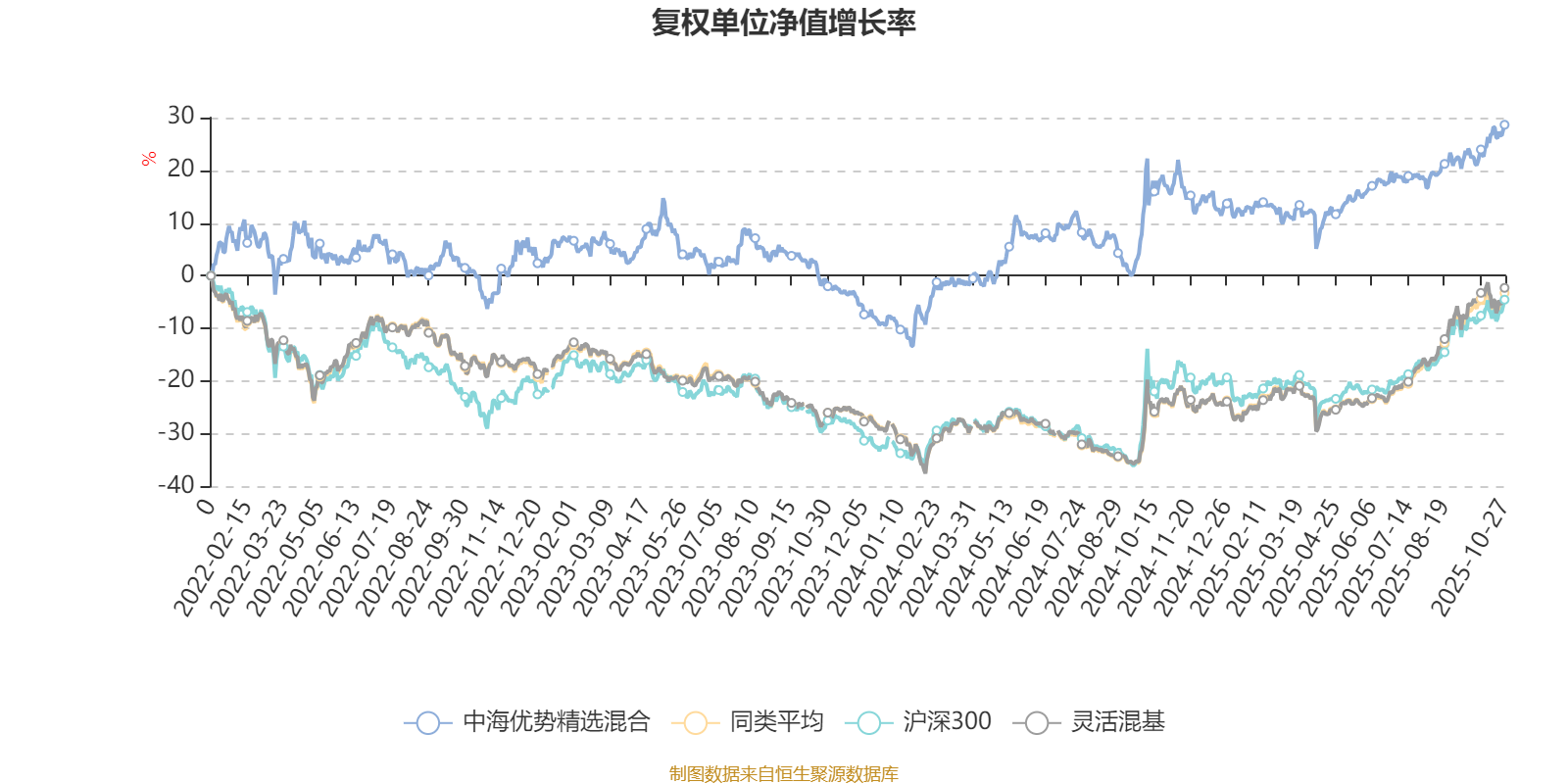 截至10月27日,中海优势精选混合近三个月复权单位净值增长率为8.59%,位于同类可比基金805/1287;近半年复权单位净值增长率为15.20%,位于同类可比基金897/1287;近一年复权单位净值增长率为9.94%,位于同类可比基金966/1287;近三年复权单位净值增长率为33.90%,位于同类可比基金285/1286。