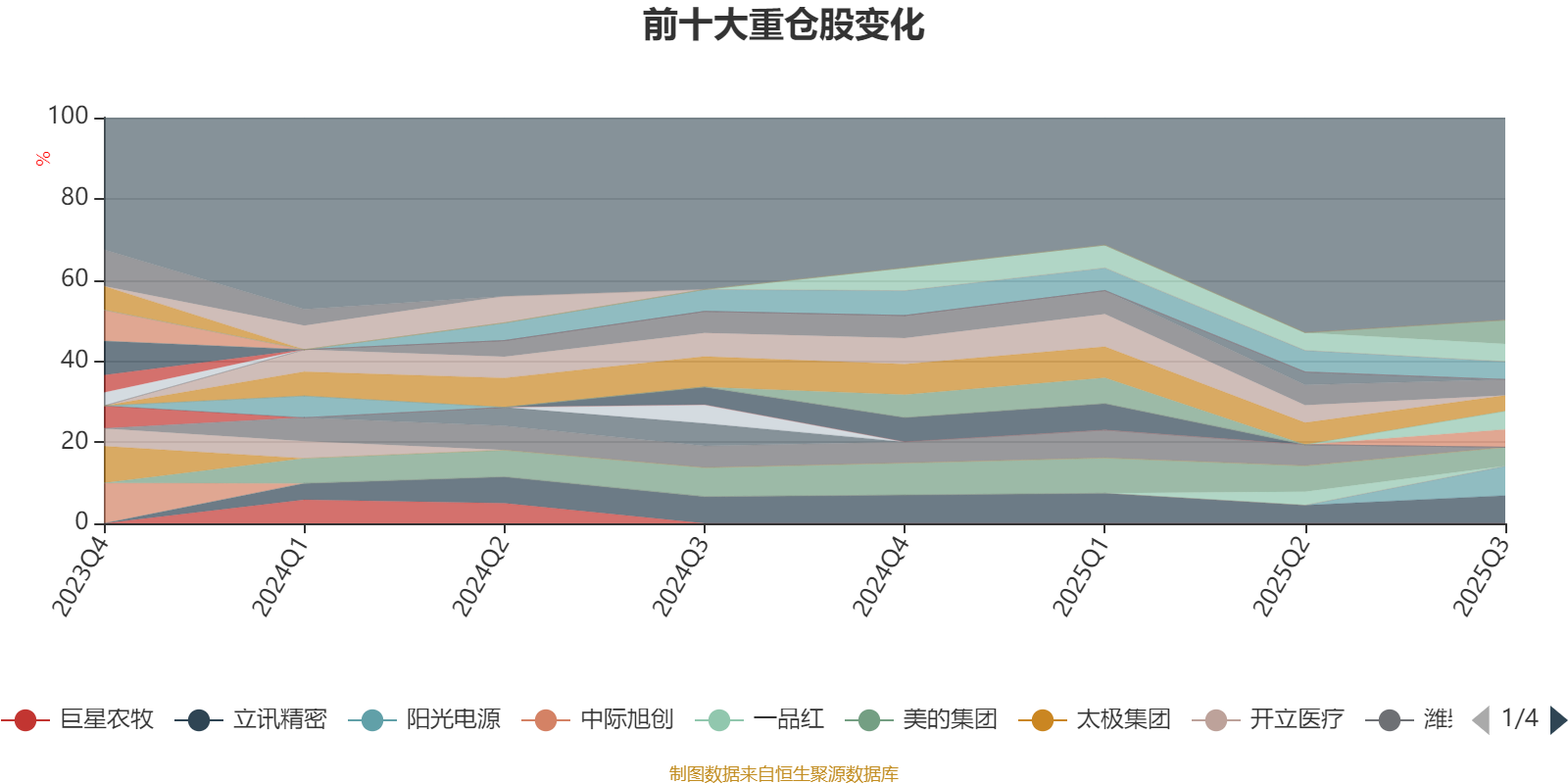 截至2025年三季度末,基金十大重仓股分别是阳光电源、立讯精密、爱旭股份、美的集团、百利天恒、贝达药业、宝丰能源、顺络电子、森麒麟、海尔智家。