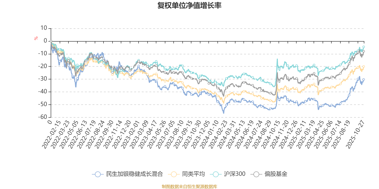 截至10月27日,民生加银稳健成长混合近三个月复权单位净值增长率为32.79%,位于同类可比基金69/689;近半年复权单位净值增长率为41.29%,位于同类可比基金141/688;近一年复权单位净值增长率为24.66%,位于同类可比基金359/653;近三年复权单位净值增长率为-11.80%,位于同类可比基金308/364。