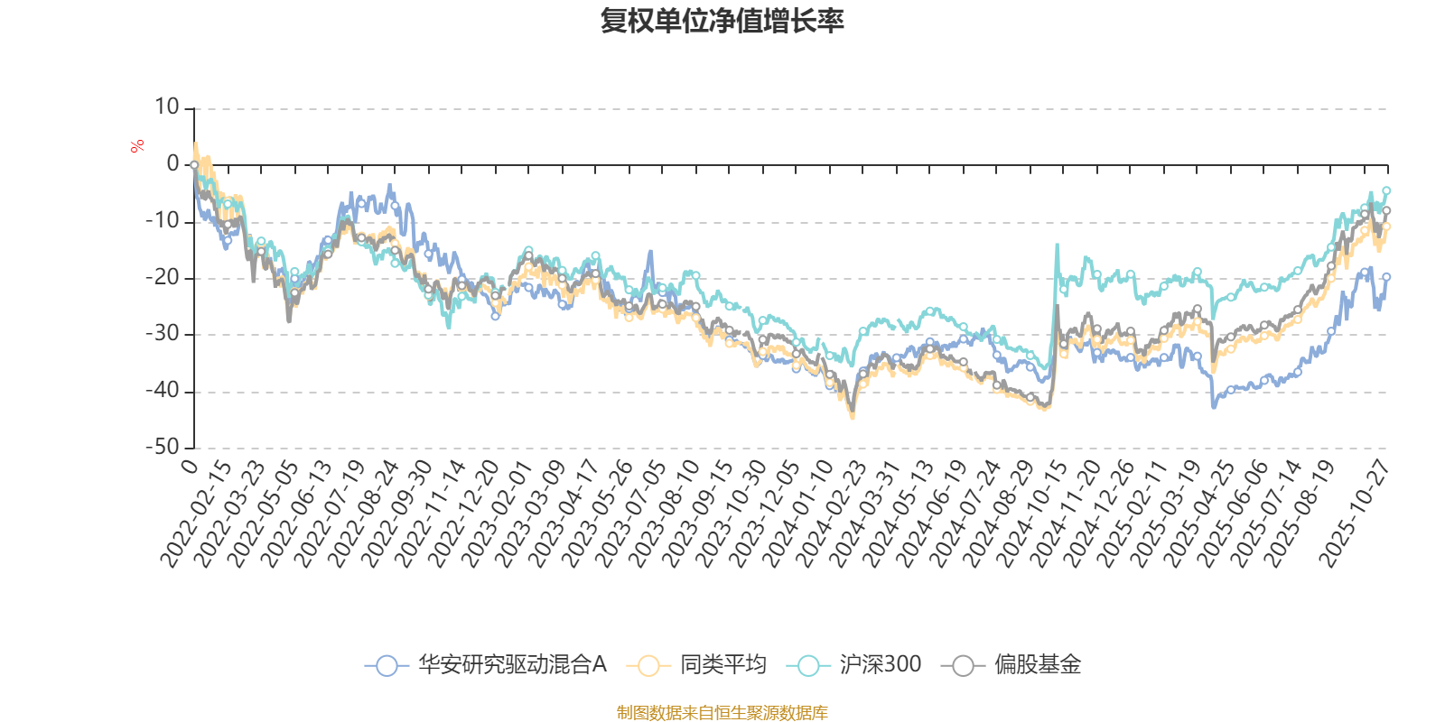 截至10月27日,华安研究驱动混合A近三个月复权单位净值增长率为23.48%,位于同类可比基金75/265;近半年复权单位净值增长率为33.10%,位于同类可比基金102/265;近一年复权单位净值增长率为16.96%,位于同类可比基金202/265;近三年复权单位净值增长率为-2.87%,位于同类可比基金213/253。