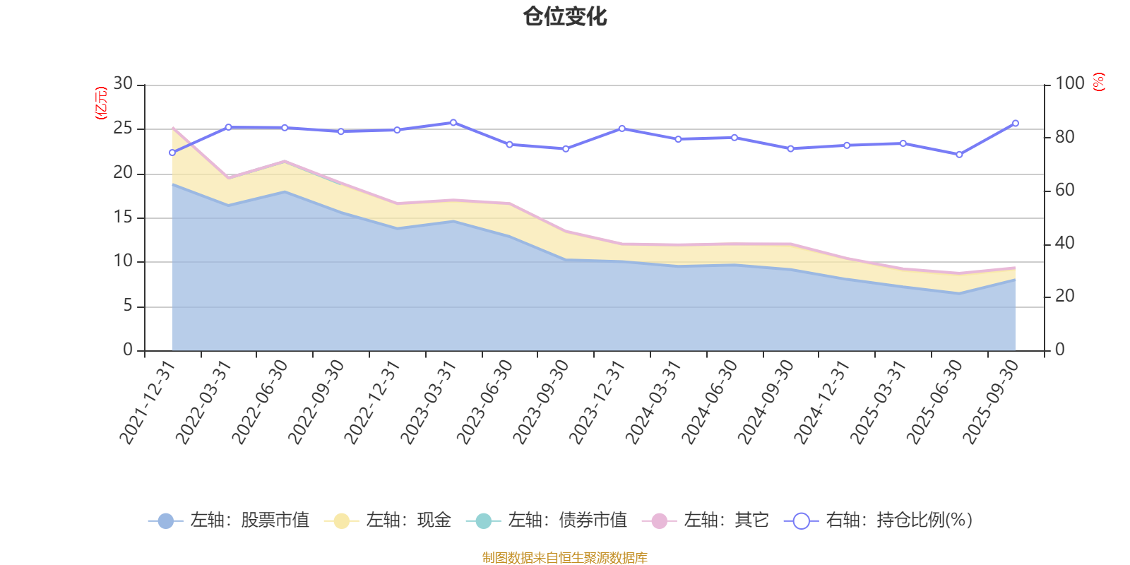 据定期报告数据统计,近三年平均股票仓位为79.65%,同类平均为85.99%。2023年一季度末基金达到85.81%的最高仓位,2025年上半年末最低,为73.75%。