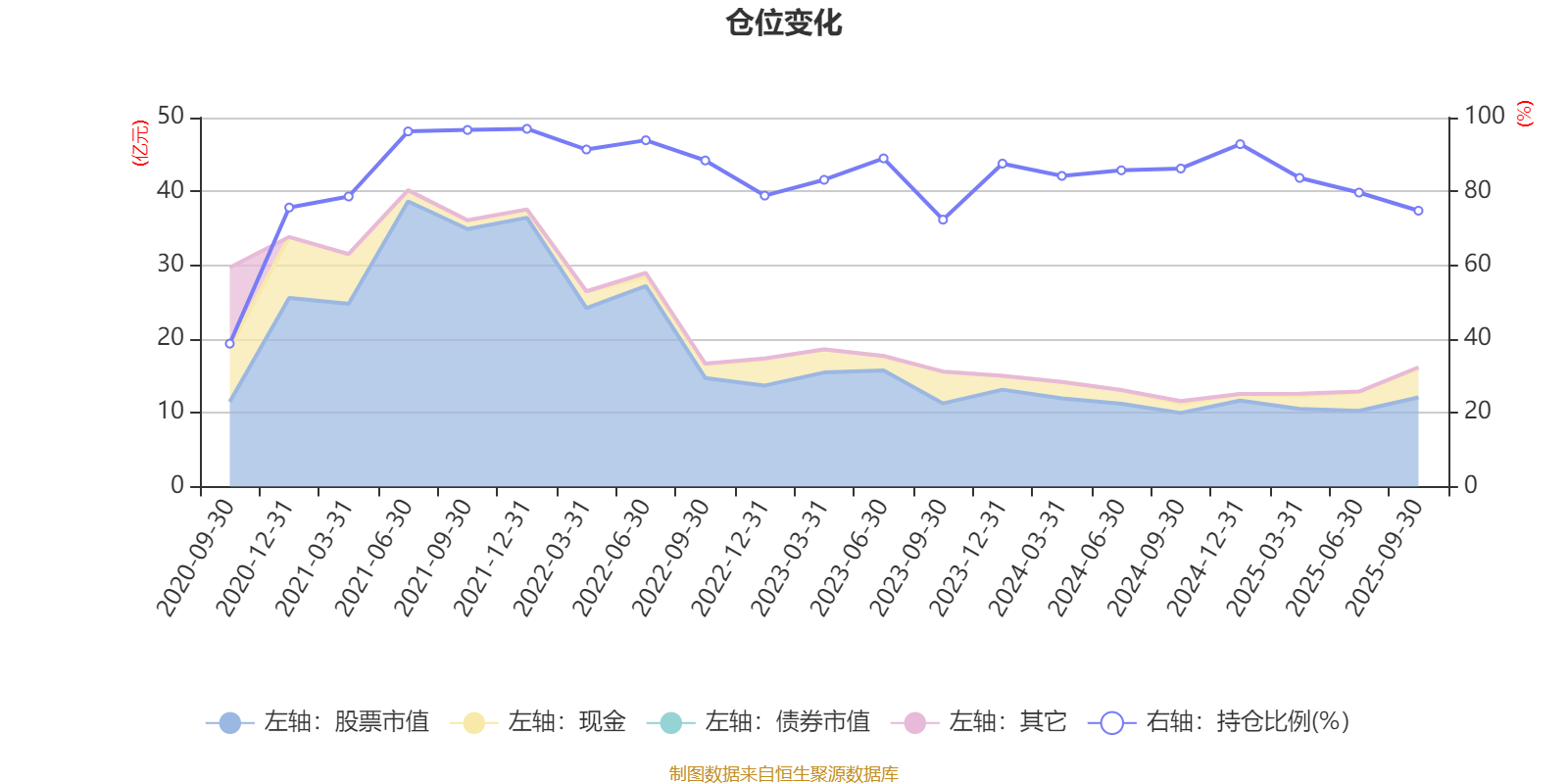 据定期报告数据统计,近三年平均股票仓位为83.15%,同类平均为87.62%。2021年末基金达到96.96%的最高仓位,2020年三季度末最低,为38.74%。
