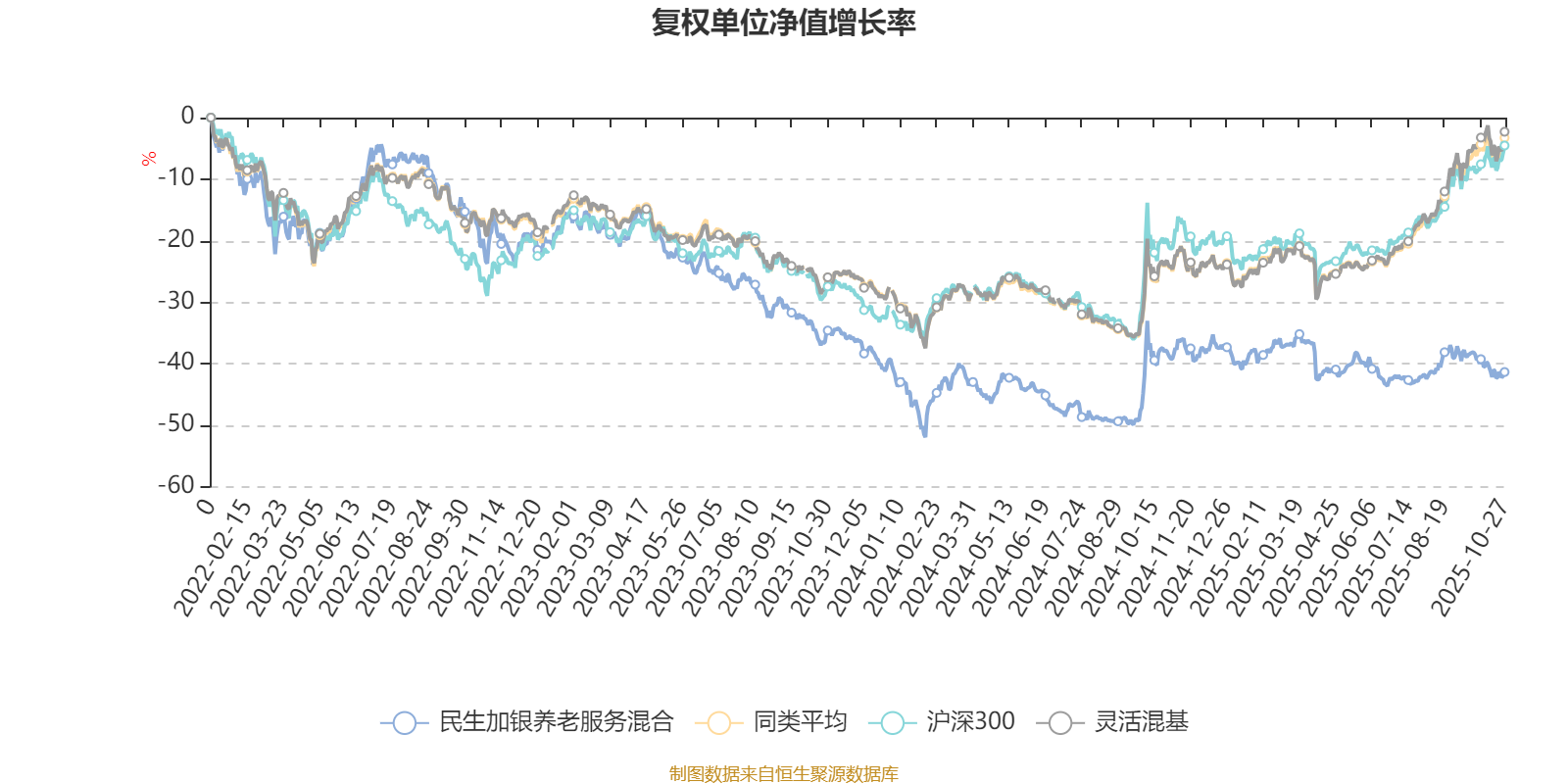 截至10月27日,民生加银养老服务混合近三个月复权单位净值增长率为1.45%,位于同类可比基金1149/1287;近半年复权单位净值增长率为-0.67%,位于同类可比基金1279/1287;近一年复权单位净值增长率为-5.68%,位于同类可比基金1278/1287;近三年复权单位净值增长率为-25.09%,位于同类可比基金1240/1286。