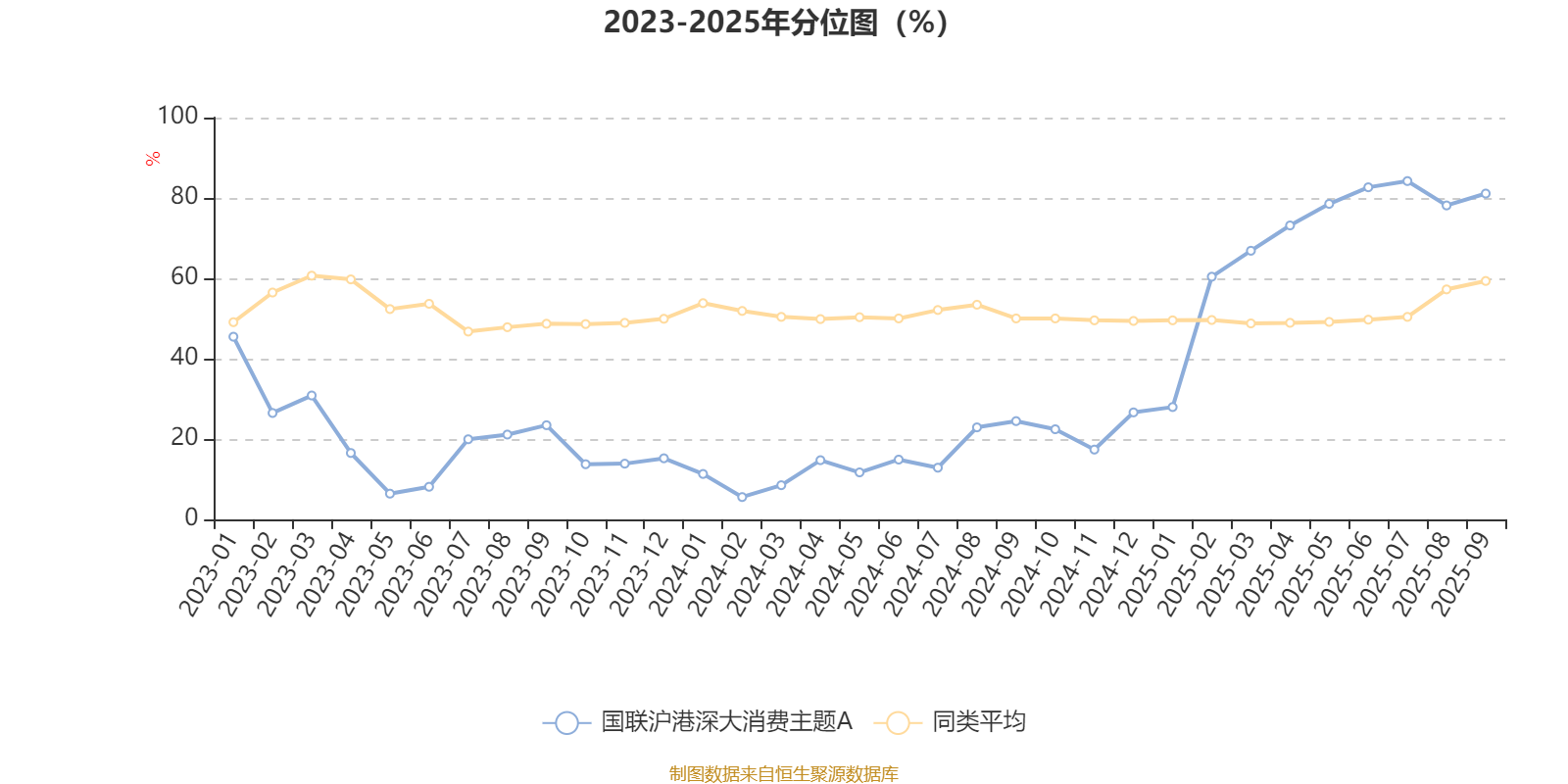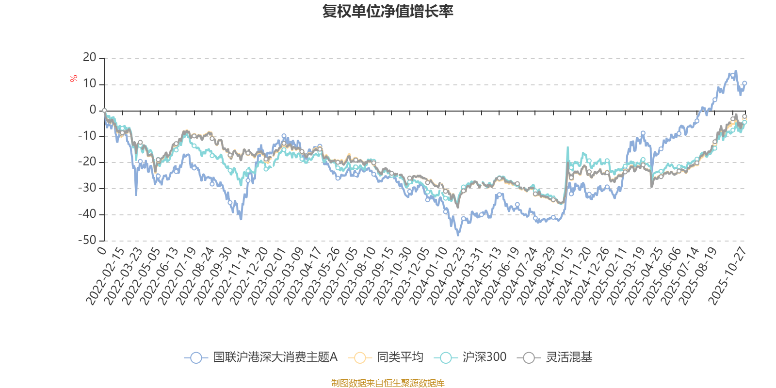 截至10月27日,国联沪港深大消费主题A近三个月复权单位净值增长率为9.53%,位于同类可比基金765/1287;近半年复权单位净值增长率为29.54%,位于同类可比基金497/1287;近一年复权单位净值增长率为55.27%,位于同类可比基金115/1287;近三年复权单位净值增长率为80.89%,位于同类可比基金40/1286。