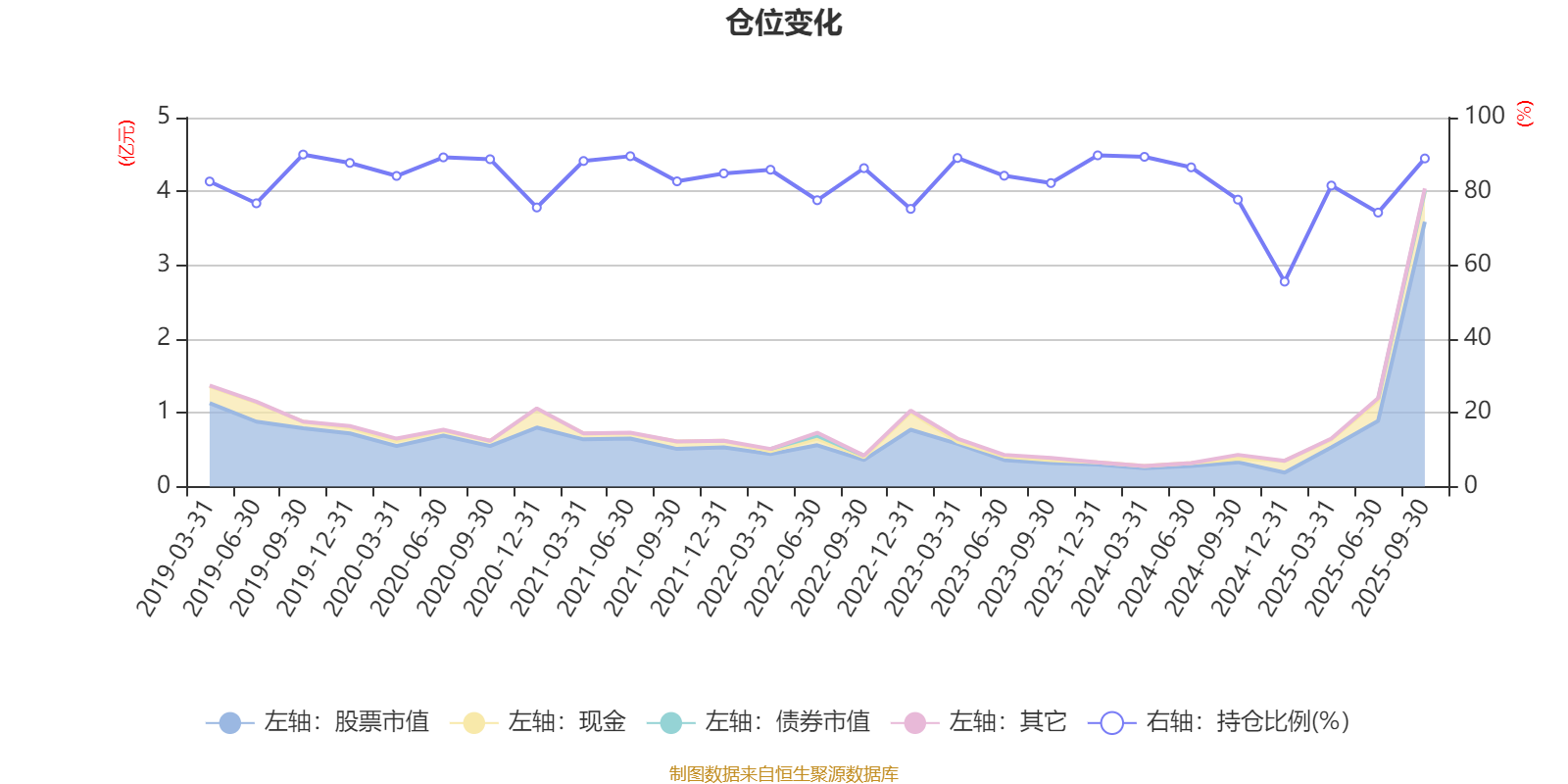 据定期报告数据统计,近三年平均股票仓位为81.21%,同类平均为72.35%。2019年三季度末基金达到89.99%的最高仓位,2024年末最低,为55.54%。