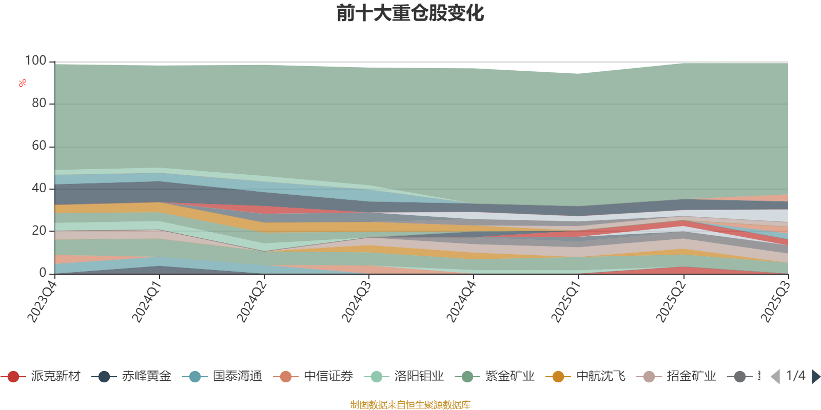 截至2025年三季度末,基金十大重仓股分别是中矿资源、紫金矿业、招金矿业、赣锋锂业、山东黄金、中远海能、江西铜业股份、铜陵有色、中国黄金国际、中国铝业。
