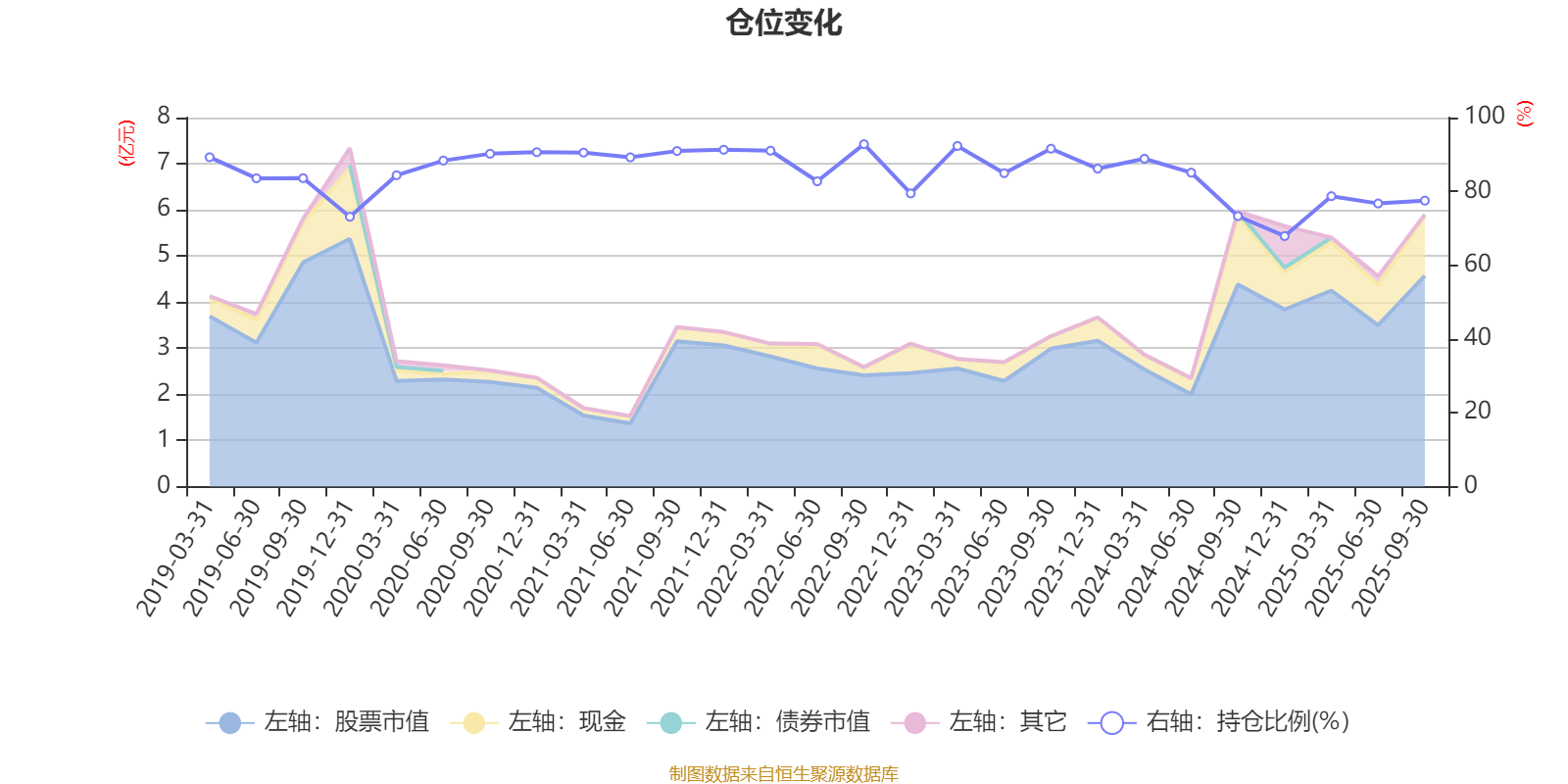 据定期报告数据统计,近三年平均股票仓位为81.88%,同类平均为72.35%。2022年三季度末基金达到92.8%的最高仓位,2024年末最低,为67.89%。