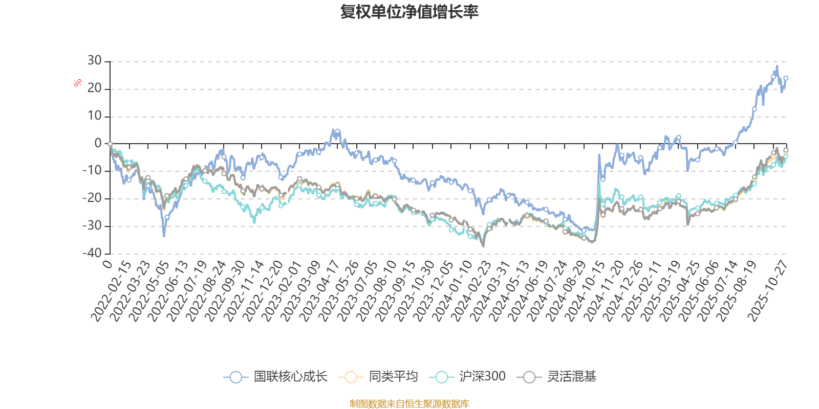 截至10月27日,国联核心成长近三个月复权单位净值增长率为18.81%,位于同类可比基金423/1287;近半年复权单位净值增长率为31.53%,位于同类可比基金445/1287;近一年复权单位净值增长率为33.54%,位于同类可比基金366/1287;近三年复权单位净值增长率为33.21%,位于同类可比基金296/1286。