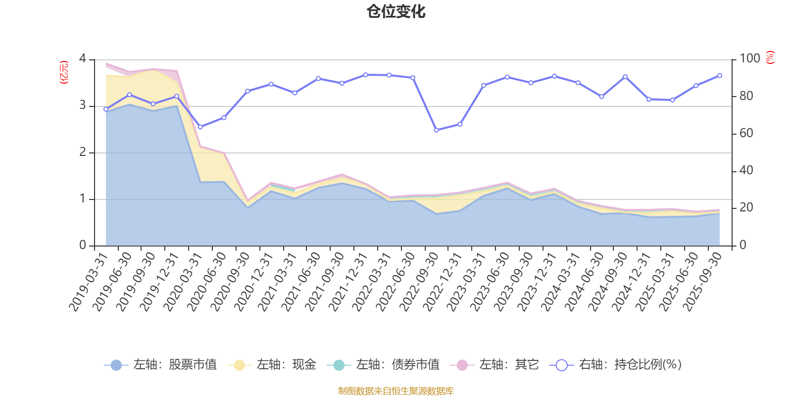 据定期报告数据统计,近三年平均股票仓位为84.38%,同类平均为72.35%。2021年末基金达到91.74%的最高仓位,2022年三季度末最低,为62.05%。
