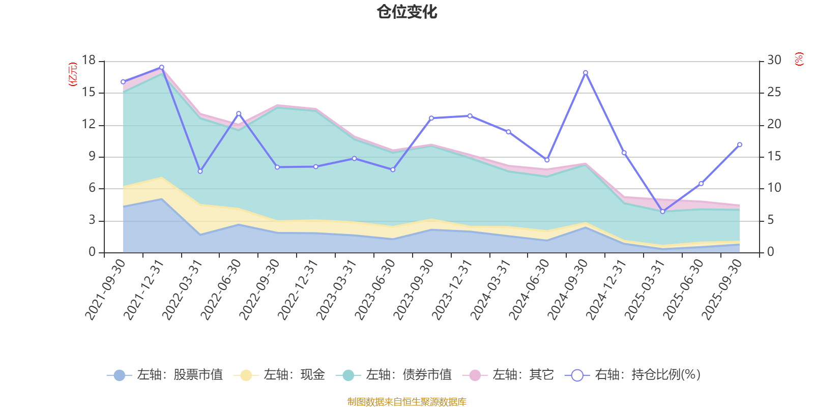 据定期报告数据统计,近三年平均股票仓位为16.26%,同类平均为19.14%。2021年末基金达到29.03%的最高仓位,2025年一季度末最低,为6.43%。