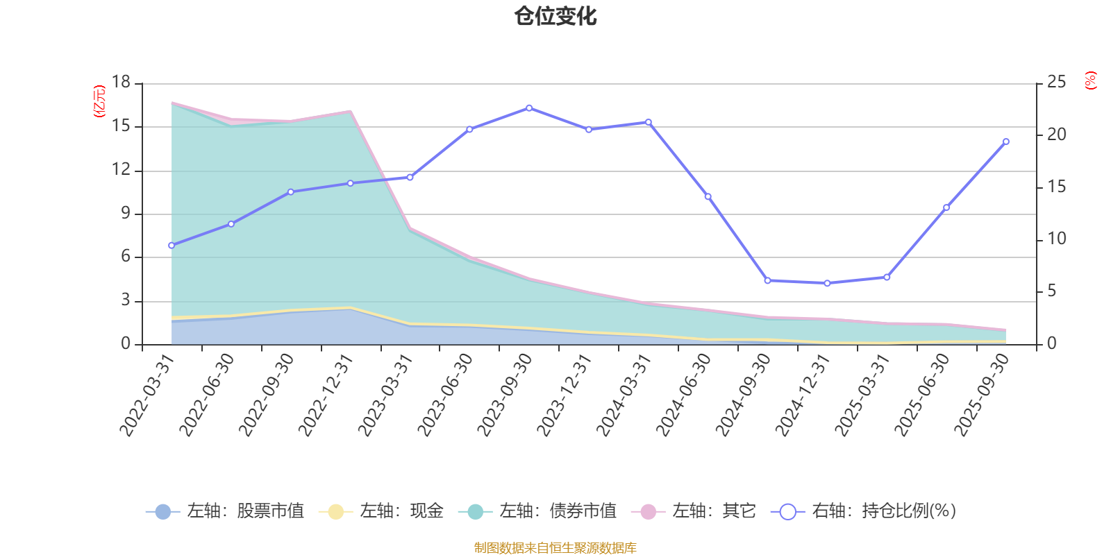 据定期报告数据统计,近三年平均股票仓位为15.13%,同类平均为19.14%。2023年三季度末基金达到22.63%的最高仓位,2024年末最低,为5.86%。