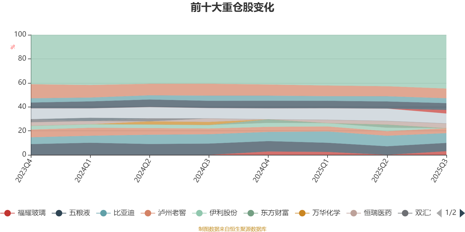 该基金持股集中度较高,且持股标的较为稳定。截至2025年三季度末,基金十大重仓股分别是兴业银行、比亚迪、贵州茅台、五粮液、美的集团、泸州老窖、中国平安、恒瑞医药、药明康德、福耀玻璃。