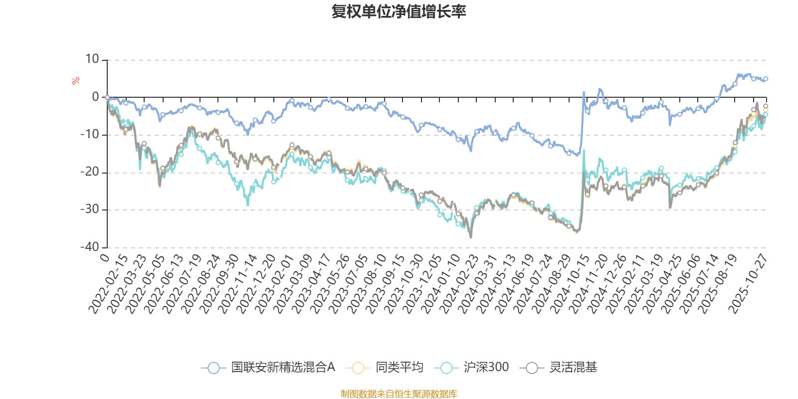 截至10月27日,国联安新精选混合A近三个月复权单位净值增长率为1.91%,位于同类可比基金1120/1287;近半年复权单位净值增长率为9.91%,位于同类可比基金1034/1287;近一年复权单位净值增长率为6.41%,位于同类可比基金1083/1287;近三年复权单位净值增长率为14.75%,位于同类可比基金650/1286。