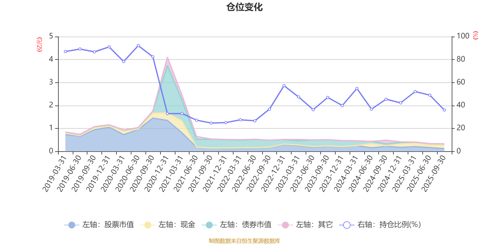 据定期报告数据统计,近三年平均股票仓位为45.39%,同类平均为72.35%。2020年上半年末基金达到92.14%的最高仓位,2021年三季度末最低,为24.73%。