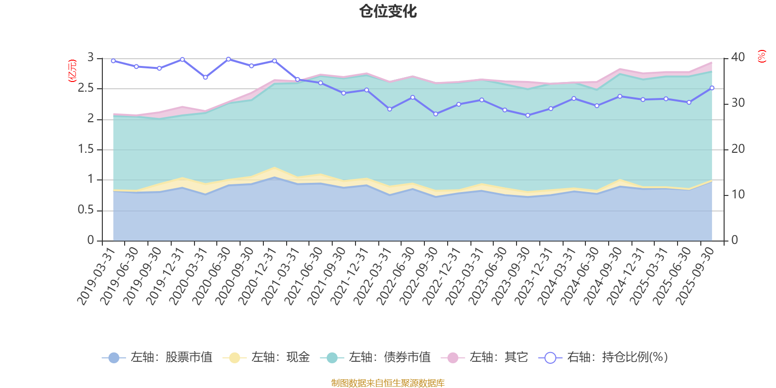 据定期报告数据统计,近三年平均股票仓位为30.35%,同类平均为19.14%。2020年上半年末基金达到39.79%的最高仓位,2023年三季度末最低,为27.49%。