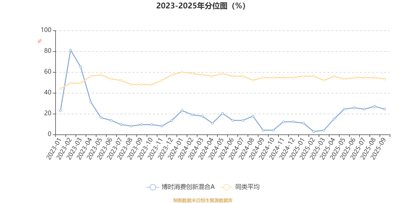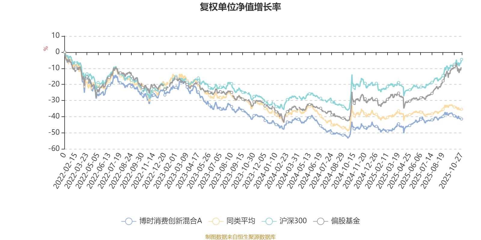 截至10月27日,博时消费创新混合A近三个月复权单位净值增长率为-1.60%,位于同类可比基金66/85;近半年复权单位净值增长率为7.48%,位于同类可比基金33/85;近一年复权单位净值增长率为9.99%,位于同类可比基金34/82;近三年复权单位净值增长率为-16.15%,位于同类可比基金68/74。