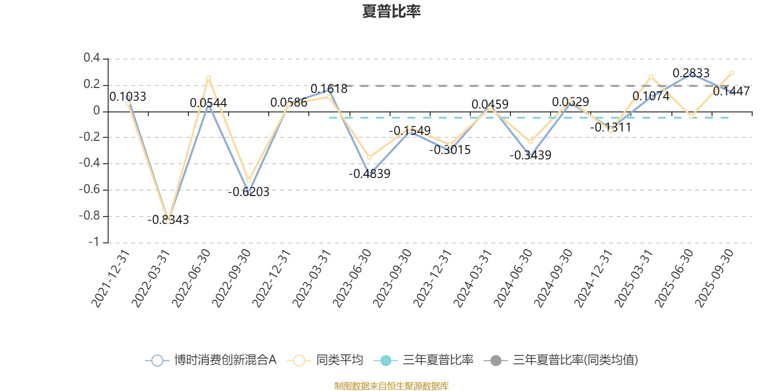 截至9月30日,基金近三年夏普比率为-0.0495,位于同类可比基金66/74。